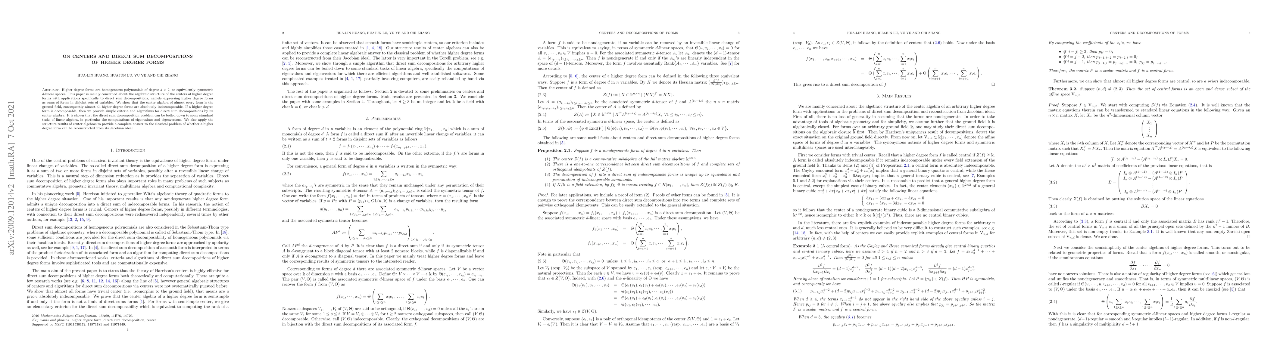 This paper investigates the algebraic structure of centers of higher degree forms and their direct sum decompositions. It demonstrates that almost all such forms are indecomposable, and provides criteria and algorithms for decomposability when it occurs, reducing the problem to linear algebra tasks like eigenvalue computations.