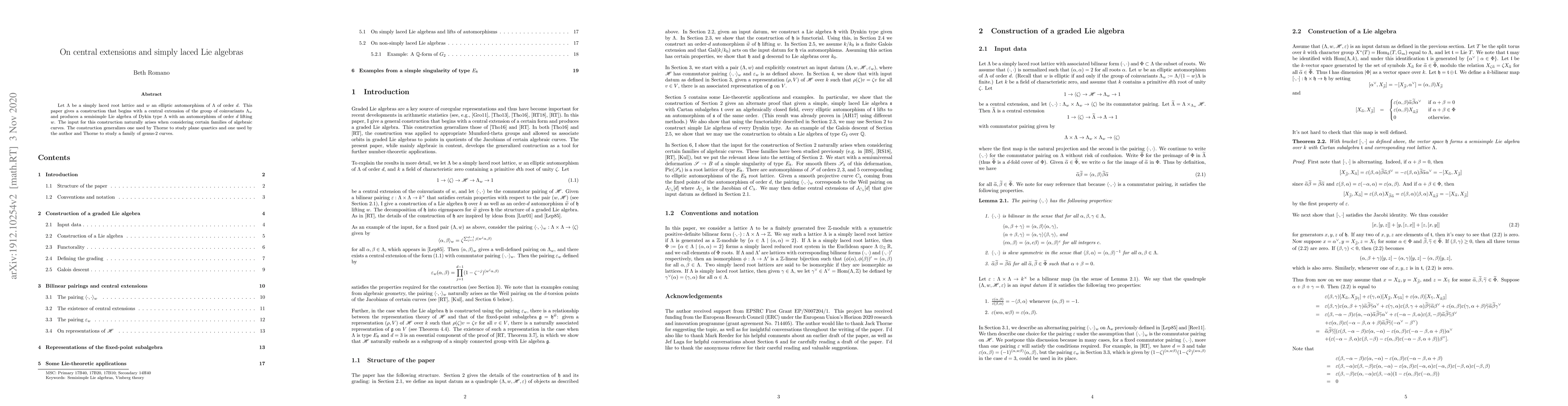 Let $\Lambda$ be a simply laced root lattice and $w$ an elliptic automorphism of $\Lambda$ of order $d$. This paper gives a construction that begins with a central extension of the group of coinvariants $\Lambda_w$ and produces a semisimple Lie algebra of Dykin type $\Lambda$ with an automorphism of order $d$ lifting $w$. The input for this construction naturally arises when considering certain families of algebraic curves. The construction generalizes one used by Thorne to study plane quartics and one used by the author and Thorne to study a family of genus-2 curves.