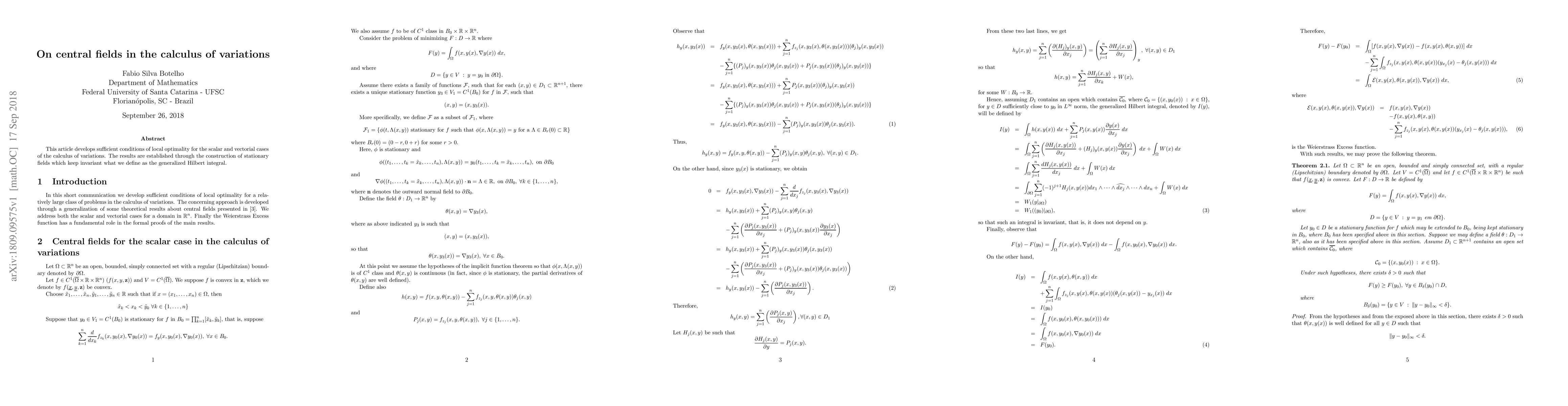 This article develops sufficient conditions of local optimality for the scalar and vectorial cases of the calculus of variations. The results are established through the construction of stationary fields which keep invariant what we define as the generalized Hilbert integral.