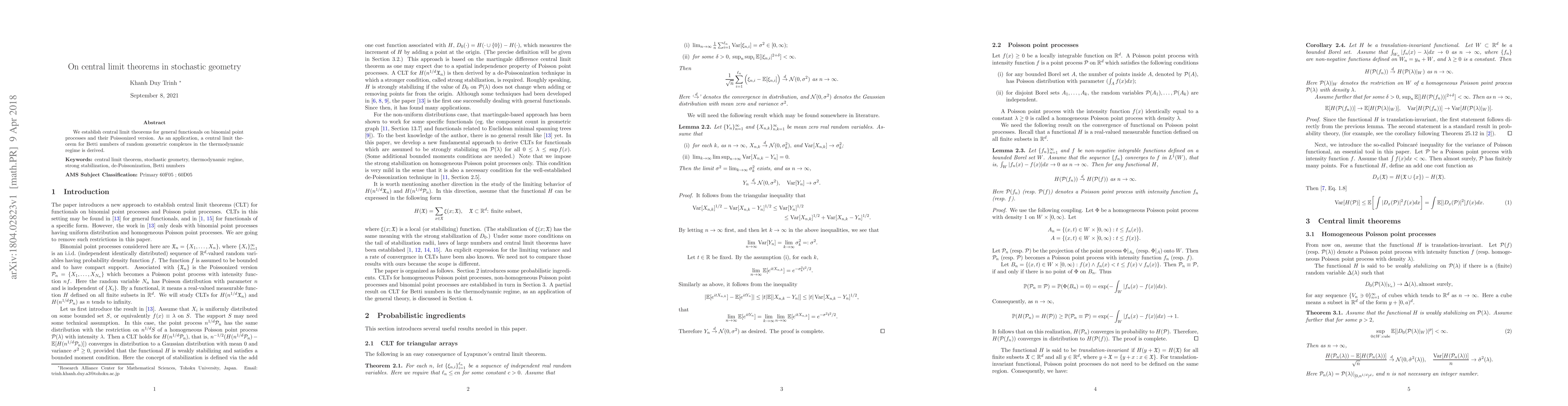 Researchers establish central limit theorems for binomial point processes and their Poissonized versions, leading to a new application in understanding random geometric complexes.
