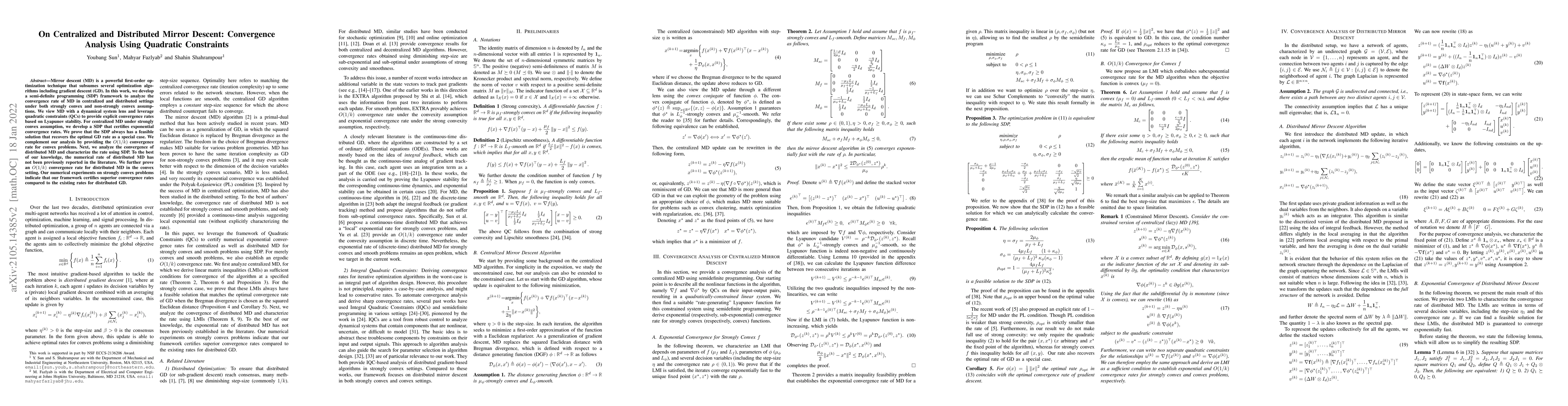 This paper develops a semi-definite programming framework to analyze the convergence rates of centralized and distributed mirror descent under quadratic constraints. It certifies exponential convergence rates for centralized mirror descent and reports the first numerical convergence rate for distributed mirror descent, showing superior performance compared to distributed gradient descent.