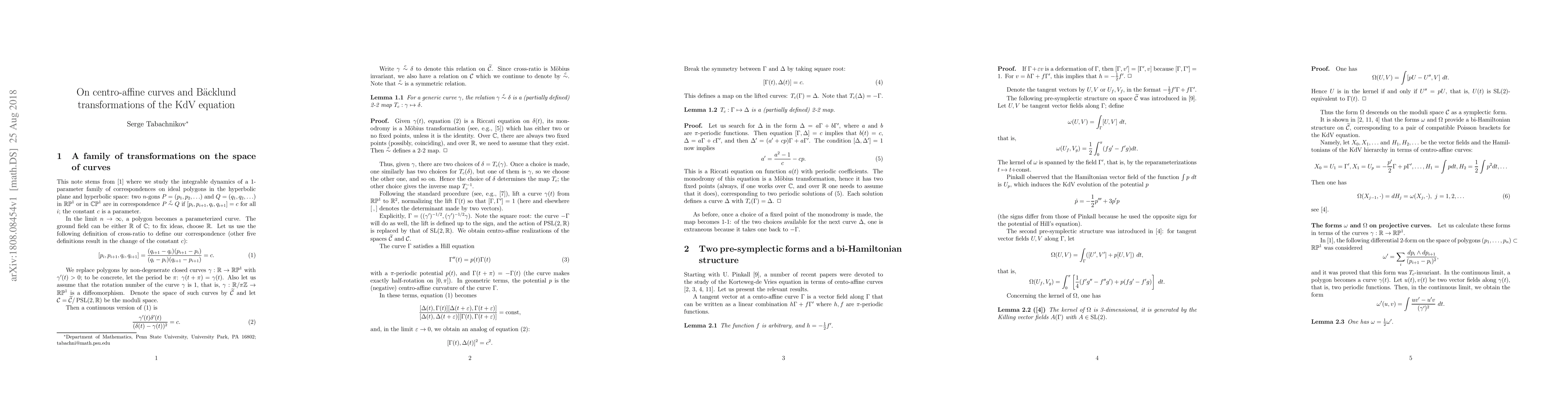 This paper explores the relationship between centro-affine curves and the Korteweg-de Vries (KdV) equation, introducing Backlund transformations that preserve presymplectic structures and commute with the KdV flow. The study also connects the KdV equation's integrals to the monodromy of Riccati equations associated with these curves.