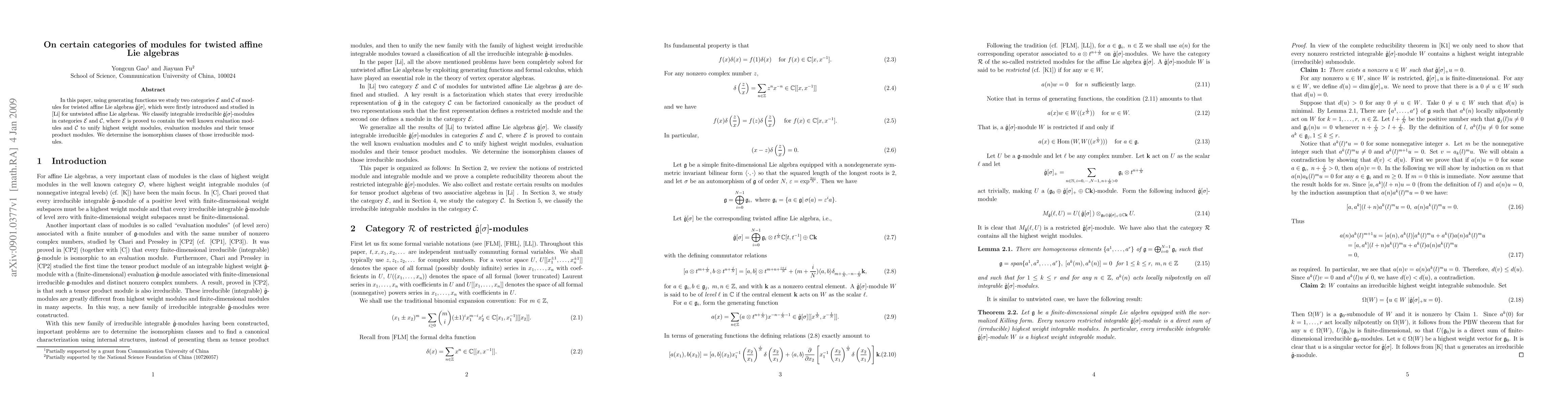 We classify integrable irreducible $\hat{g}[\sigma]$-modules in categories E and C, where E is proved to contain the well known evaluation modules and C to unify highest weight modules, evaluation modules and their tensor product modules.