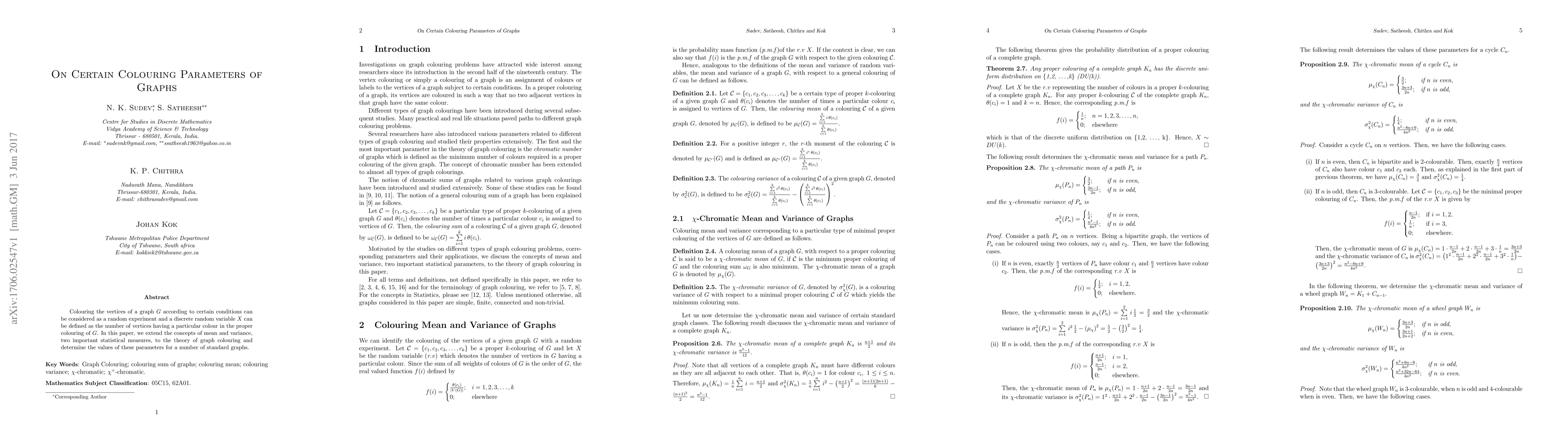 Colouring the vertices of a graph $G$ according to certain conditions can be considered as a random experiment and a discrete random variable $X$ can be defined as the number of vertices having a particular colour in the proper colouring of $G$. In this paper, we extend the concepts of mean and variance, two important statistical measures, to the theory of graph colouring and determine the values of these parameters for a number of standard graphs.
