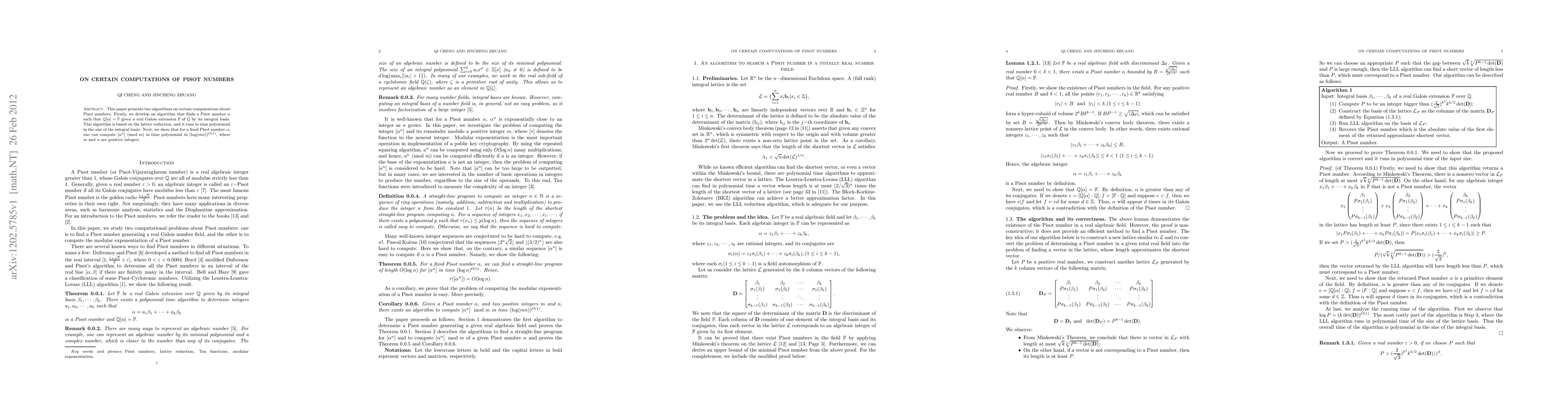 This paper presents two algorithms on certain computations about Pisot numbers. Firstly, we develop an algorithm that finds a Pisot number $\alpha$ such that $\Q[\alpha] = \F$ given a real Galois extension $\F$ of $\Q$ by its integral basis. This algorithm is based on the lattice reduction, and it runs in time polynomial in the size of the integral basis. Next, we show that for a fixed Pisot number $\alpha$, one can compute $ [\alpha^n] \pmod{m}$ in time polynomial in $(\log (m n))^{O(1)}$, where $m$ and $n$ are positive integers.