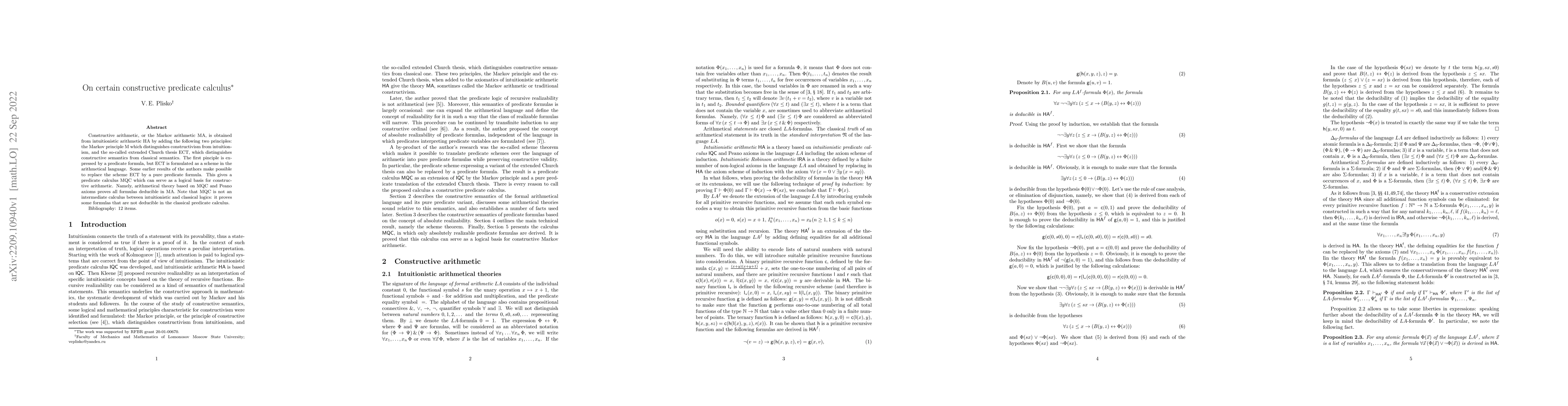 Constructive arithmetic, or the Markov arithmetic MA, is obtained from intuitionistic arithmetic HA by adding the following two principles: the Markov principle M which distinguishes constructivism from intuitionism, and the so-called extended Church thesis ECT, which distinguishes constructive semantics from classical semantics. The first principle is expressed by a predicate formula, but ECT is formulated as a scheme in the arithmetical language. Some earlier results of the authors make possible to replace the scheme ECT by a pure predicate formula. This gives a predicate calculus MQC which can serve as a logical basis for constructive arithmetic. Namely, arithmetical theory based on MQC and Peano axioms proves all formulas deducible in MA. Note that MQC is not an intermediate calculus between intuitionistic and classical logics: it proves some formulas that are not deducible in the classical predicate calculus. Bibliography: 12 items.