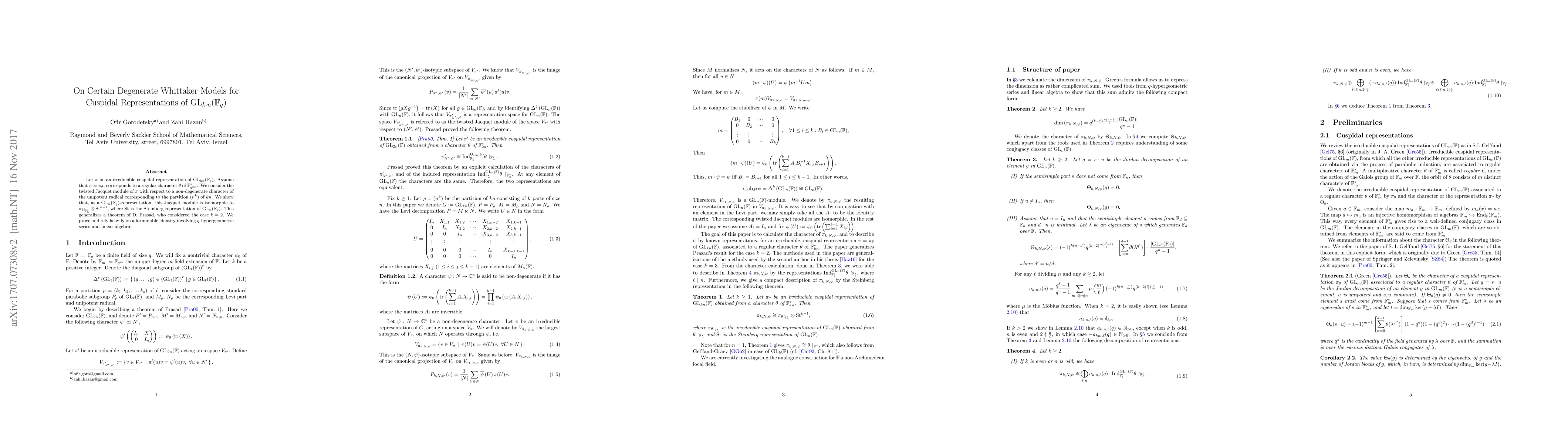 This paper investigates the degenerate Whittaker models for cuspidal representations of $\mathrm{GL}_{kn}\left(\mathbb{F}_q\right)$, showing that the twisted Jacquet module corresponds to $\pi_{\theta \upharpoonright_{\mathbb{F}_n^*}} \otimes \mathrm{St}^{k-1}$. The result generalizes a theorem by D. Prasad and relies on a complex identity involving $q$-hypergeometric series and linear algebra.