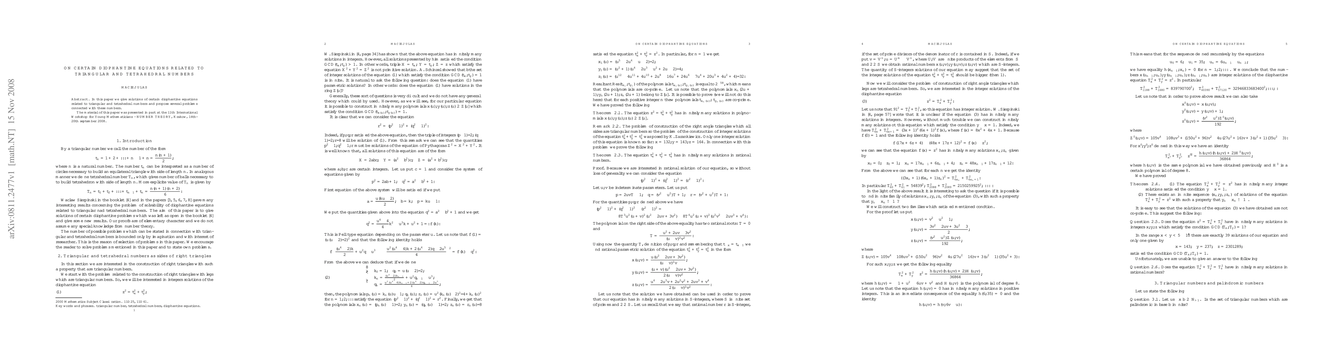 This paper presents solutions to specific Diophantine equations related to triangular and tetrahedral numbers and proposes additional problems connected to these mathematical constructs. The findings were partially presented at the 11th International Workshop for Young Mathematicians in Kraków in 2008.