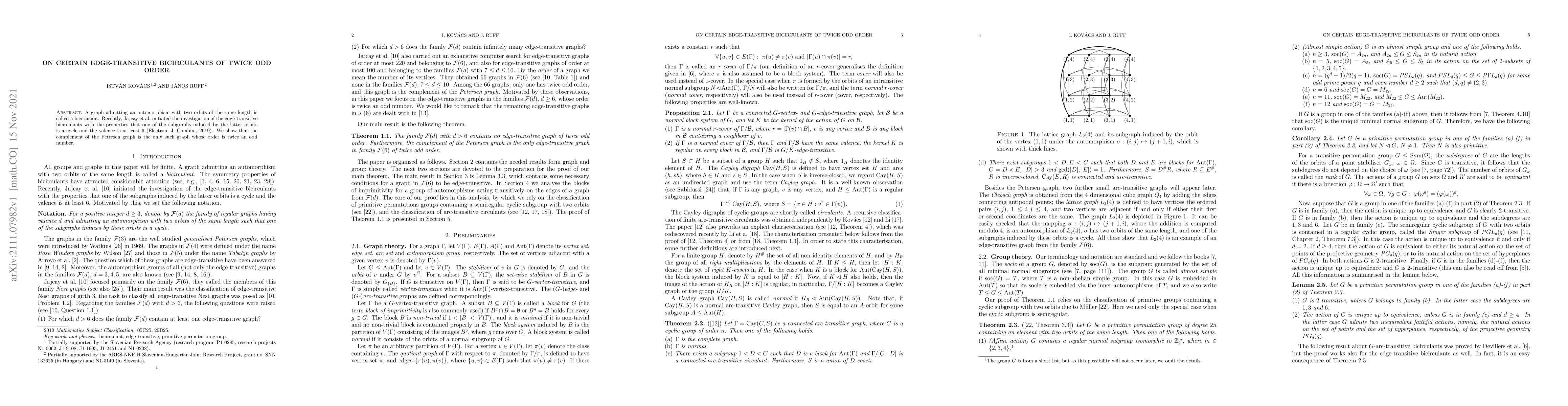 A graph admitting an automorphism with two orbits of the same length is called a bicirculant. Recently, Jajcay et al. initiated the investigation of the edge-transitive bicirculants with the properties that one of the subgraphs induced by the latter orbits is a cycle and the valence is at least $6$ (Electron. J. Combin., 2019). We show that the complement of the Petersen graph is the only such graph whose order is twice an odd number.