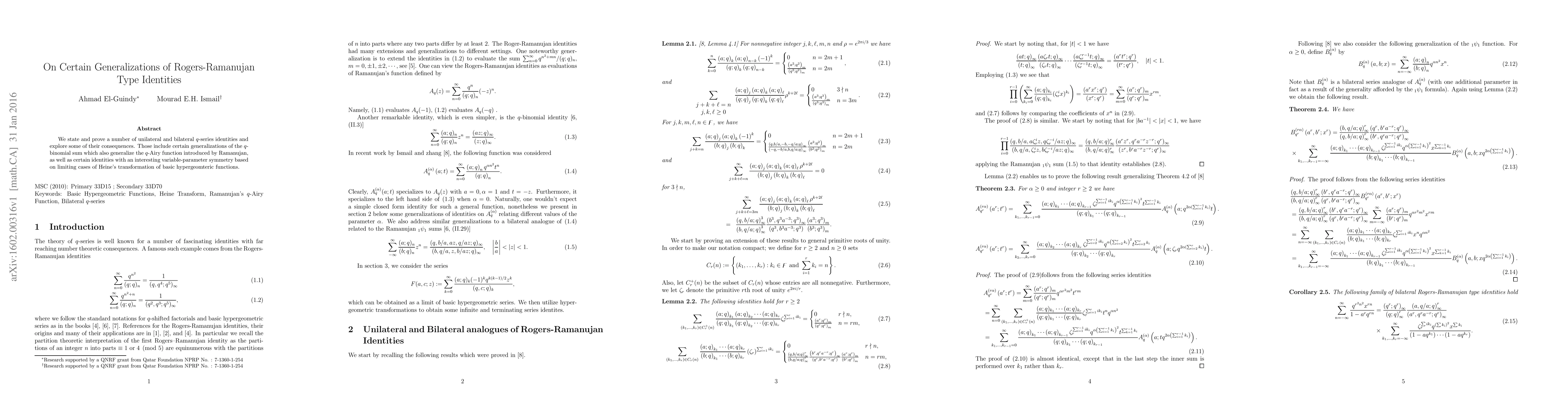 This paper proves new identities for q-series, generalizing Ramanujan's q-binomial sum and the q-Airy function, with interesting variable-parameter symmetry based on Heine's transformation of basic hypergeometric functions.