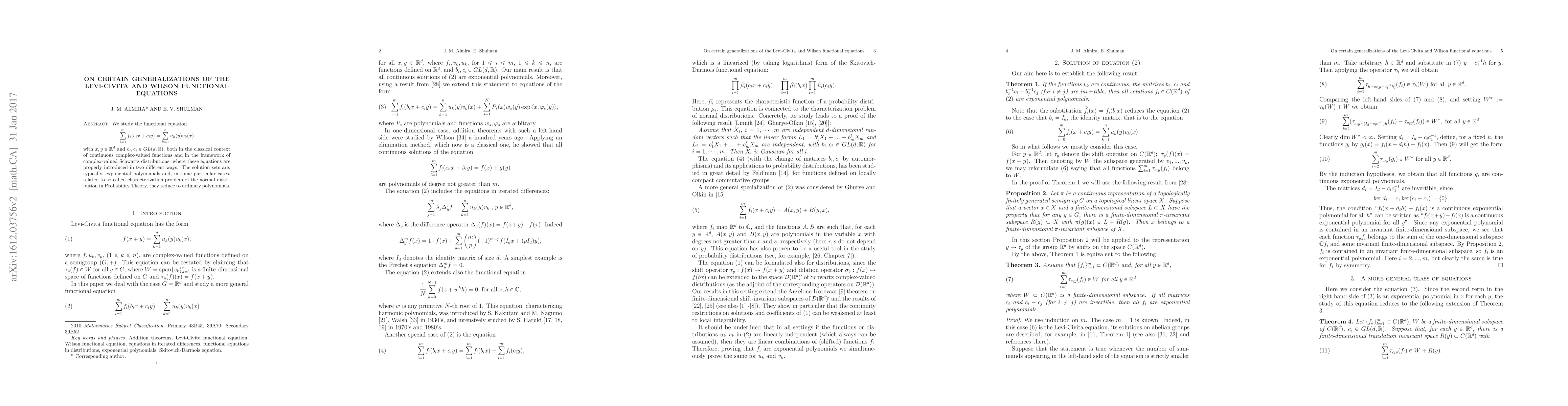 We study the functional equation \[ \sum_{i=1}^mf_i(b_ix+c_iy)= \sum_{k=1}^nu_k(y)v_k(x) \] with $x,y\in\mathbb{R}^d$ and $b_i,c_i\in {GL}(d,\mathbb{R})$, both in the classical context of continuous complex-valued functions and in the framework of complex-valued Schwartz distributions, where these equations are properly introduced in two different ways. The solution sets are, typically, exponential polynomials and, in some particular cases, related to so called characterization problem of the normal distribution in Probability Theory, they reduce to ordinary polynomials.
