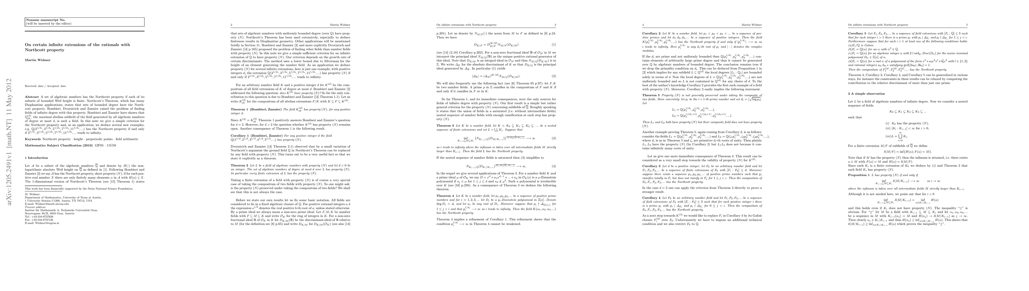 This paper presents a simple criterion for determining the Northcott property in certain infinite extensions of the rationals, applying it to deduce new examples like $\IQ(2^{1/d_1},3^{1/d_2},5^{1/d_3},7^{1/d_4},11^{1/d_5},...)$, which possesses the Northcott property if and only if the sequence $(2^{1/d_1},3^{1/d_2},5^{1/d_3},7^{1/d_4},11^{1/d_5},...)$ tends to infinity.