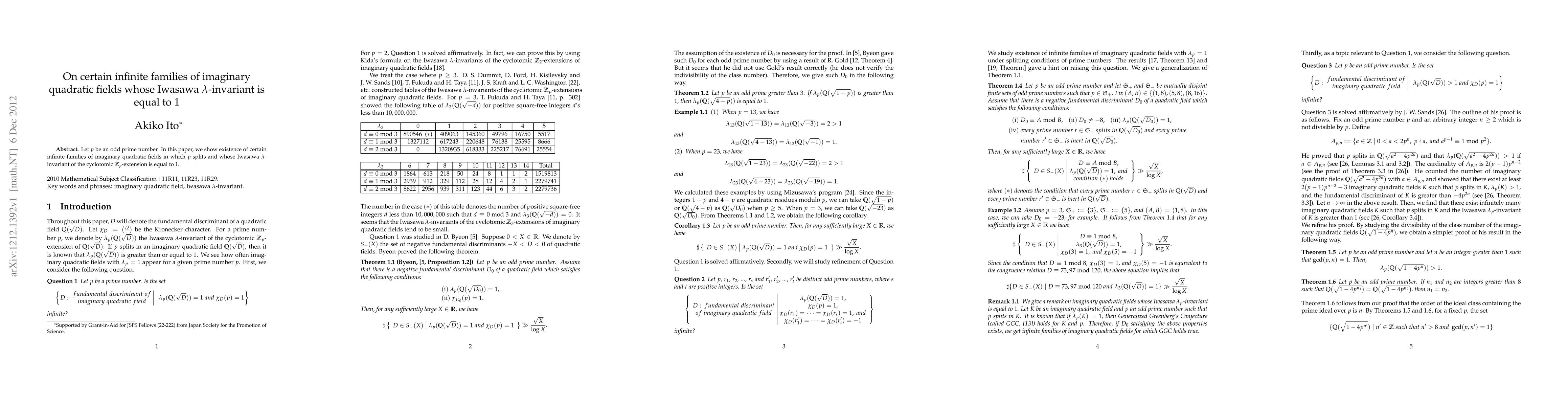 Summary: This paper demonstrates the existence of infinite families of imaginary quadratic fields where an odd prime p splits, and the Iwasawa λ-invariant for the cyclotomic Zp-extension equals 1. The focus is on the structure of these fields and their properties.