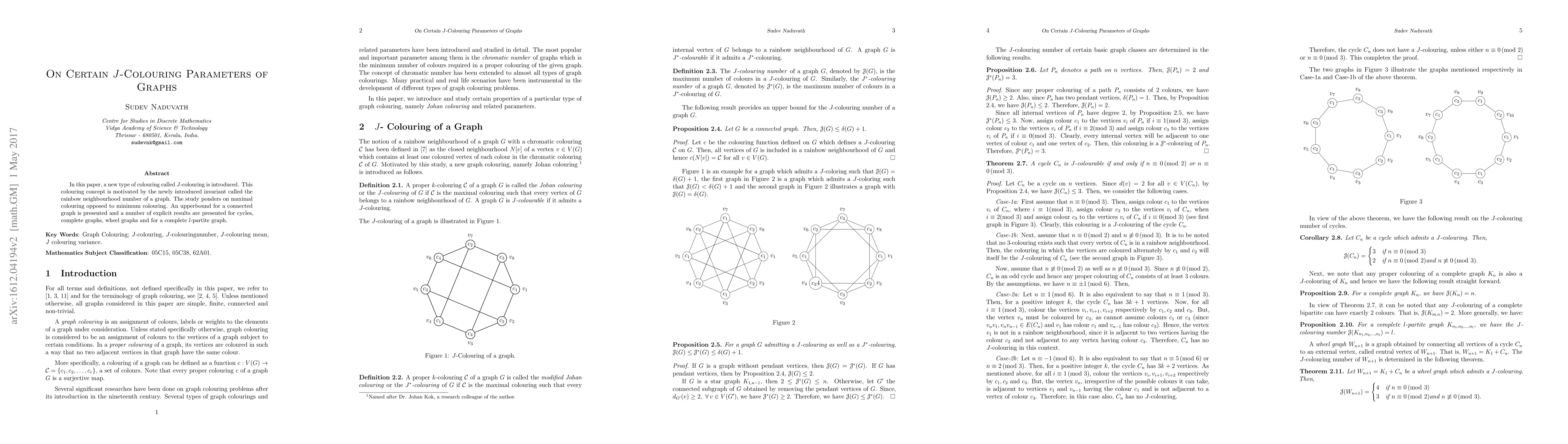 The paper presents a new graph colouring concept (Johan colouring) and derives upper bounds and explicit results for the J-colouring number of various graph classes, including paths, cycles, complete graphs, and wheel graphs.
