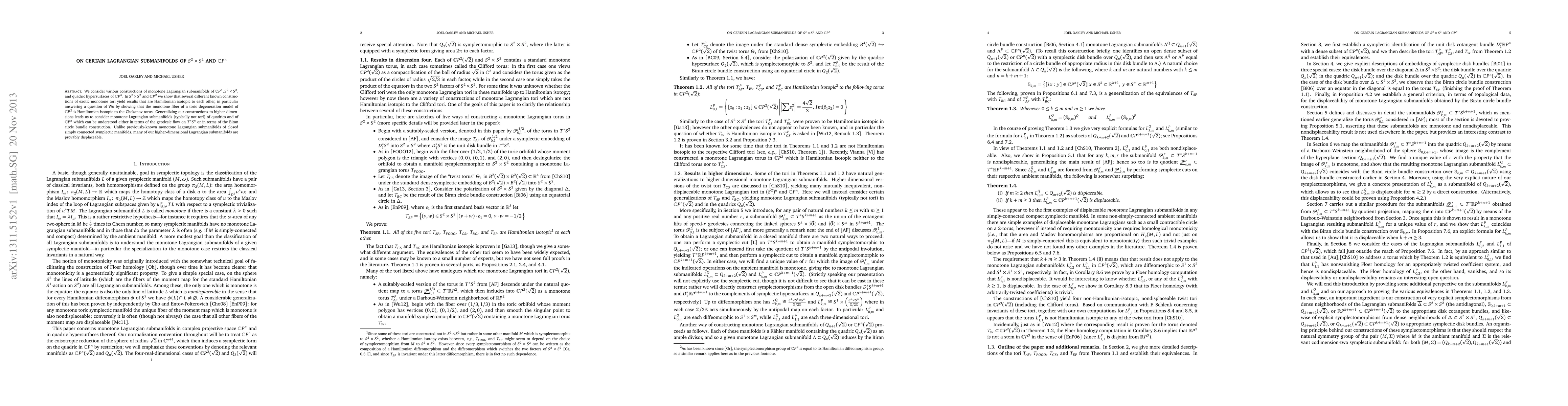 This paper studies various constructions of monotone Lagrangian submanifolds in $S^2\times S^2$ and $C P^n$, showing that several exotic monotone tori in these spaces are Hamiltonian isotopic to each other. It extends these findings to higher dimensions, revealing that many higher-dimensional Lagrangian submanifolds are displaceable.