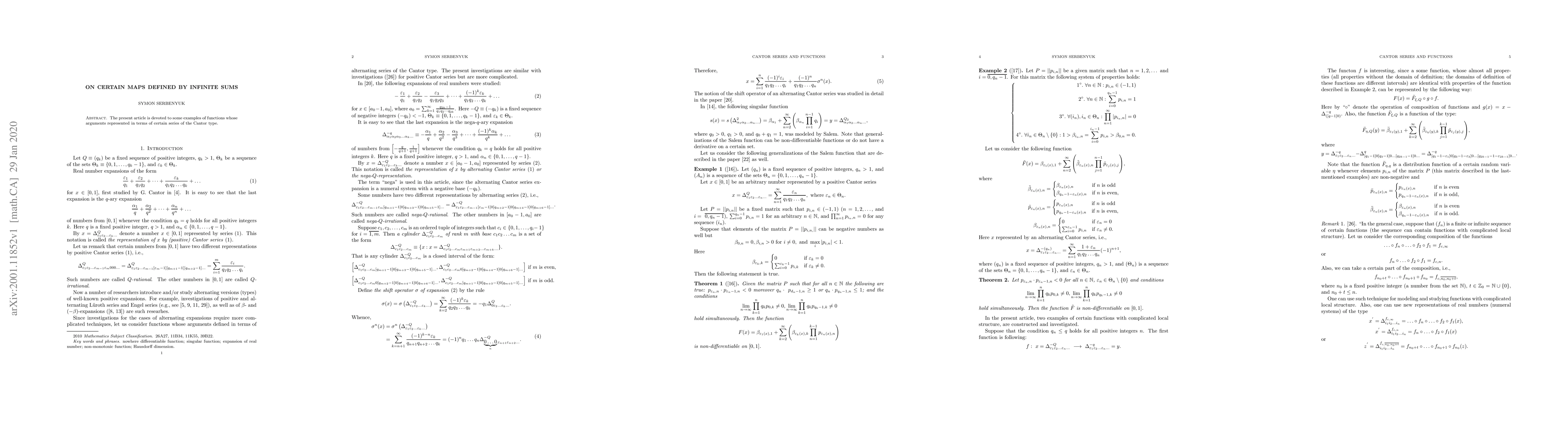 The present article is devoted to some examples of functions whose arguments represented in terms of certain series of the Cantor type.