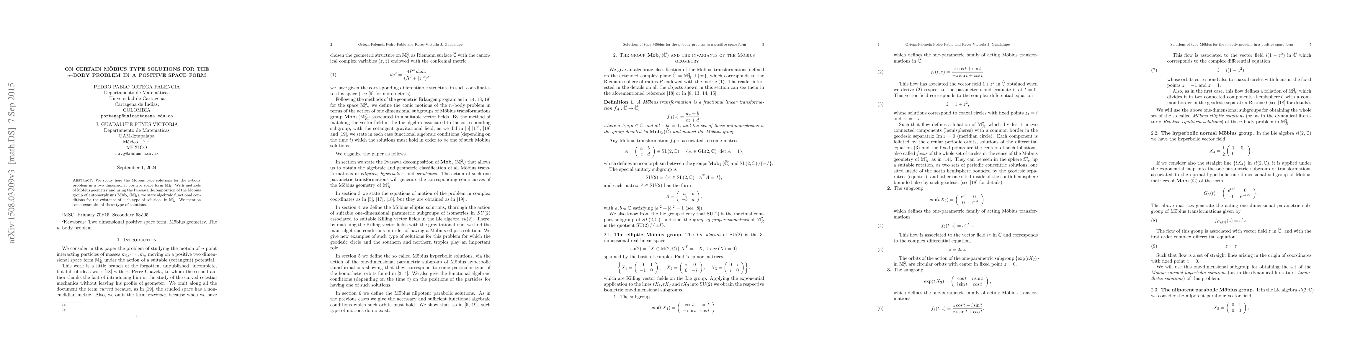 We study here the Mobius type solutions for the n-body problem in a two dimensional positive space form M^2_R. With methods of Mobius geometry and using the Iwasawa decomposition of the Mobius group of automorphisms Mob_2 (M^2_R), we state algebraic functional conditions for the existence of such type of solutions in M^2_R. We mention some examples of these type of solutions.