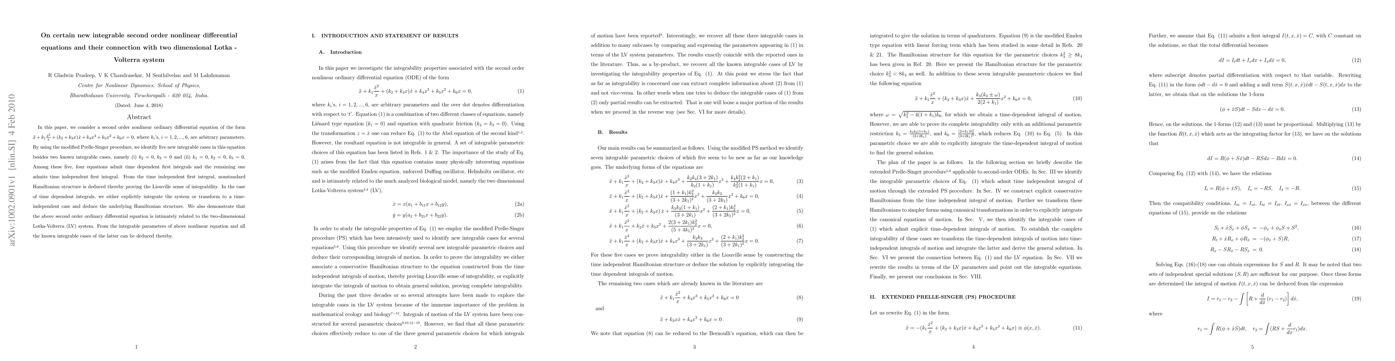 Researchers identified five new integrable cases of a second-order nonlinear differential equation related to the two-dimensional Lotka-Volterra system, with four admitting time-dependent first integrals and one admitting a time-independent first integral.