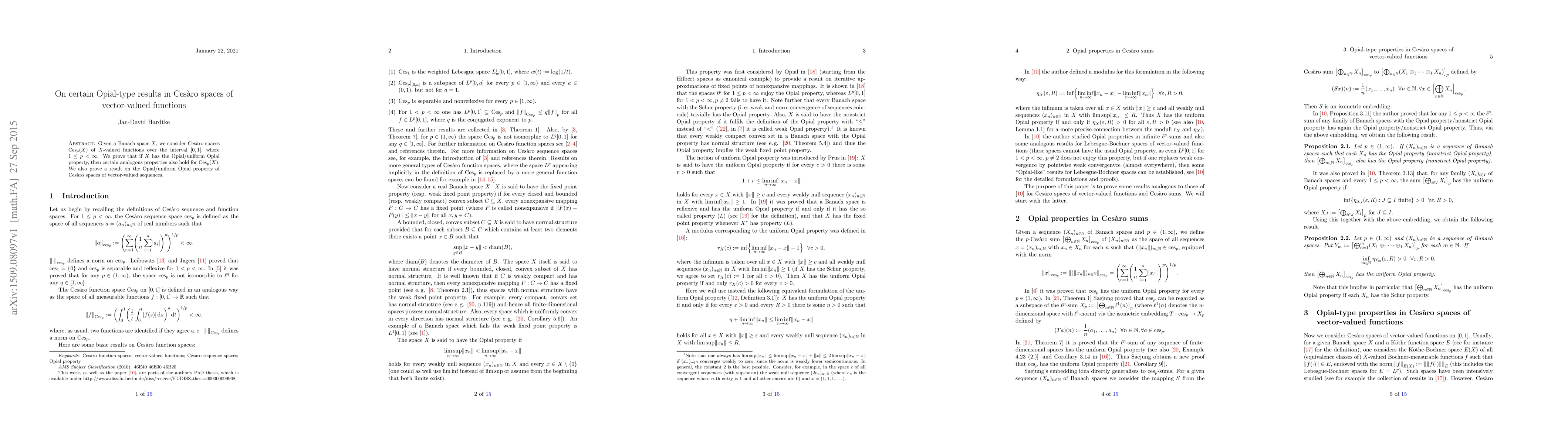 Given a Banach space $X$, we consider Ces\`aro spaces $\text{Ces}_p(X)$ of $X$-valued functions over the interval $[0,1]$, where $1\leq p<\infty$. We prove that if $X$ has the Opial/uniform Opial property, then certain analogous properties also hold for $\text{Ces}_p(X)$. We also prove a result on the Opial/uniform Opial property of Ces\`aro spaces of vector-valued sequences.