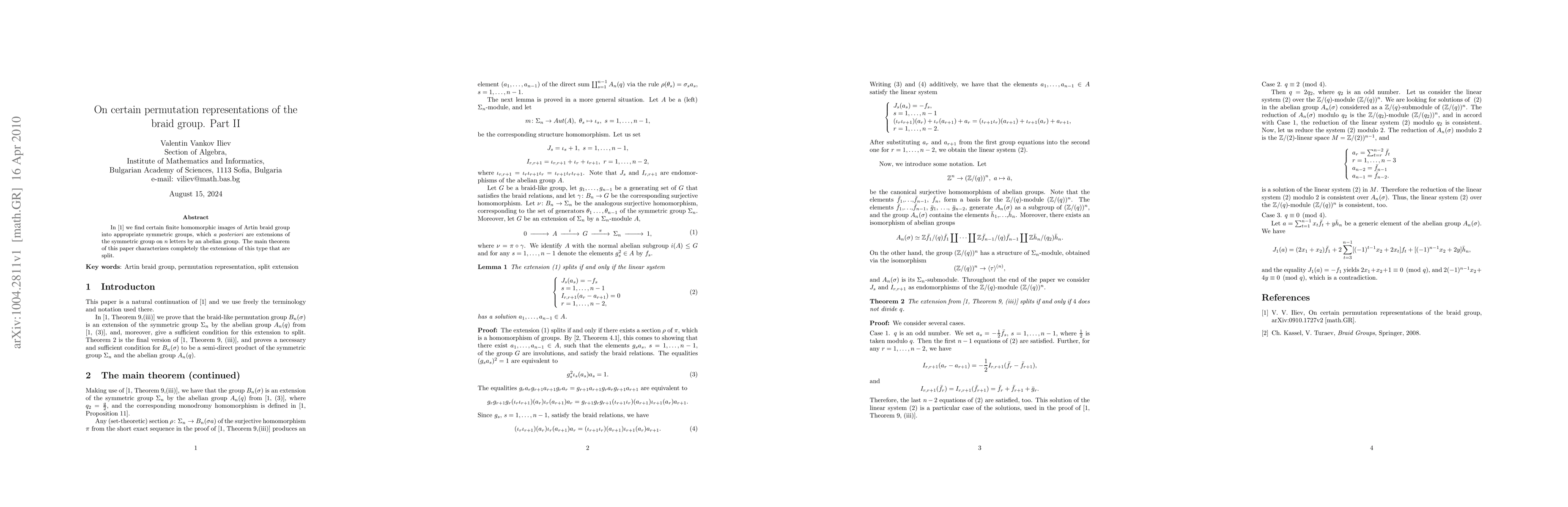 In arXiv:0910.1727 we find certain finite homomorphic images of Artin braid group into appropriate symmetric groups, which a posteriori are extensions of the symmetric group on n letters by an abelian group. The main theorem of this paper characterizes completely the extensions of this type that are split.