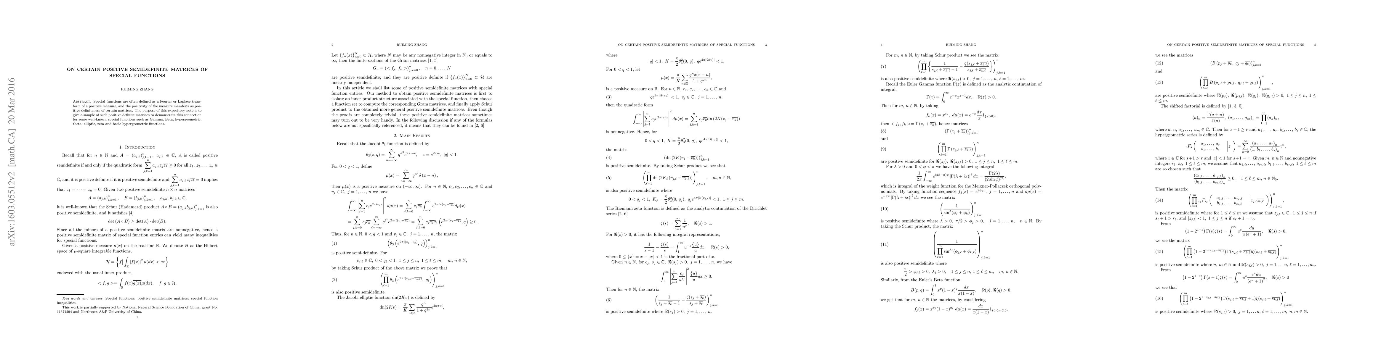 This paper explores the positive definite matrices associated with well-known special functions, illustrating how the positivity of measures translates into the positive definiteness of matrices for functions like Gamma, Beta, hypergeometric, theta, elliptic, zeta, and basic hypergeometric functions.