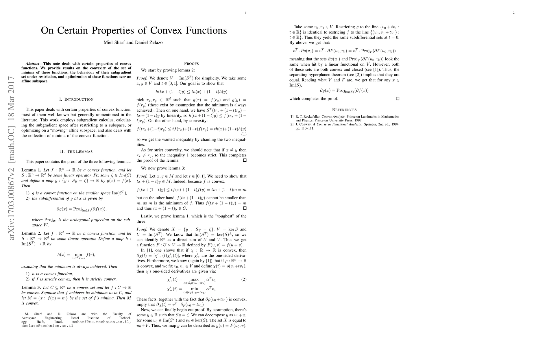This paper investigates properties of convex functions, including the convexity of their minimum sets, the behavior of subgradient sets under restrictions, and optimization techniques over affine subspaces.