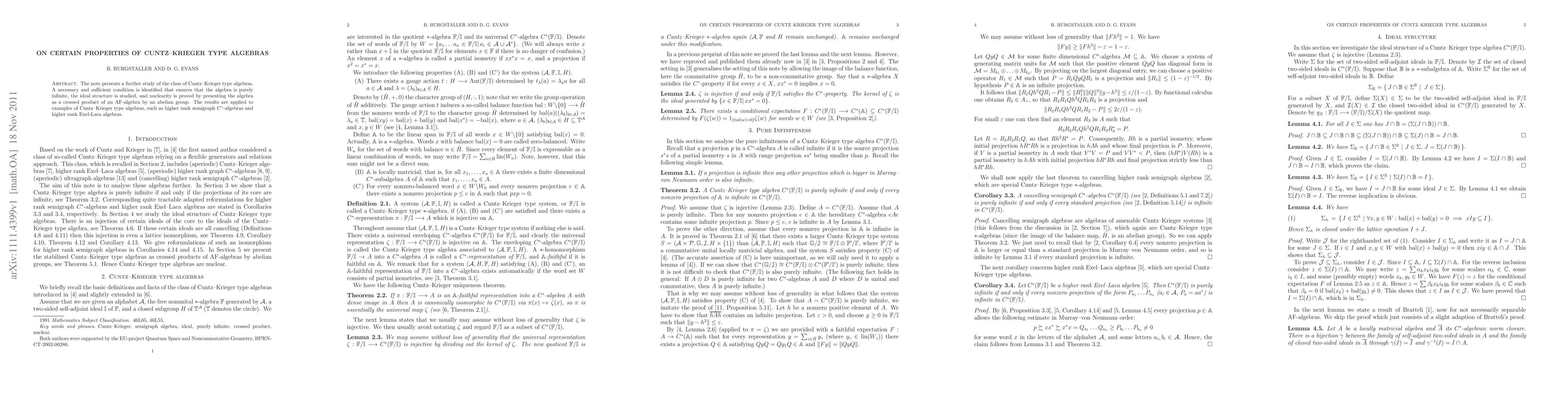 The note presents a further study of the class of Cuntz--Krieger type algebras. A necessary and sufficient condition is identified that ensures that the algebra is purely infinite, the ideal structure is studied, % and applied to semigraph algebras, and nuclearity is proved by presenting the algebra as a crossed product of an AF-algebra by an abelian group. The results are applied to examples of Cuntz--Krieger type algebras, such as higher rank semigraph $C^*$-algebras and higher rank Exel-Laca algebras.