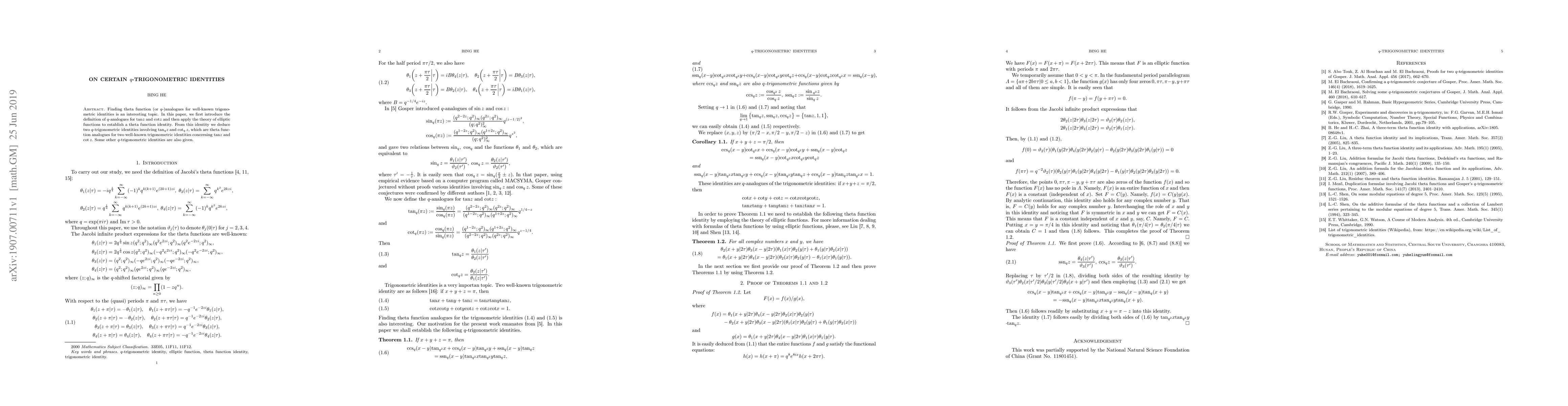 Finding theta function (or $q$-)analogues for well-known trigonometric identities is an interesting topic. In this paper, we first introduce the definition of $q$-analogues for $\mathrm{tan}z$ and $\mathrm{cot}z$ and then apply the theory of elliptic functions to establish a theta function identity. From this identity we deduce two $q$-trigonometric identities involving $\mathrm{tan}_{q}z$ and $\cot_{q}z,$ which are theta function analogues for two well-known trigonometric identities concerning $\mathrm{tan}z$ and $\cot z.$ Some other $q$-trigonometric identities are also given.