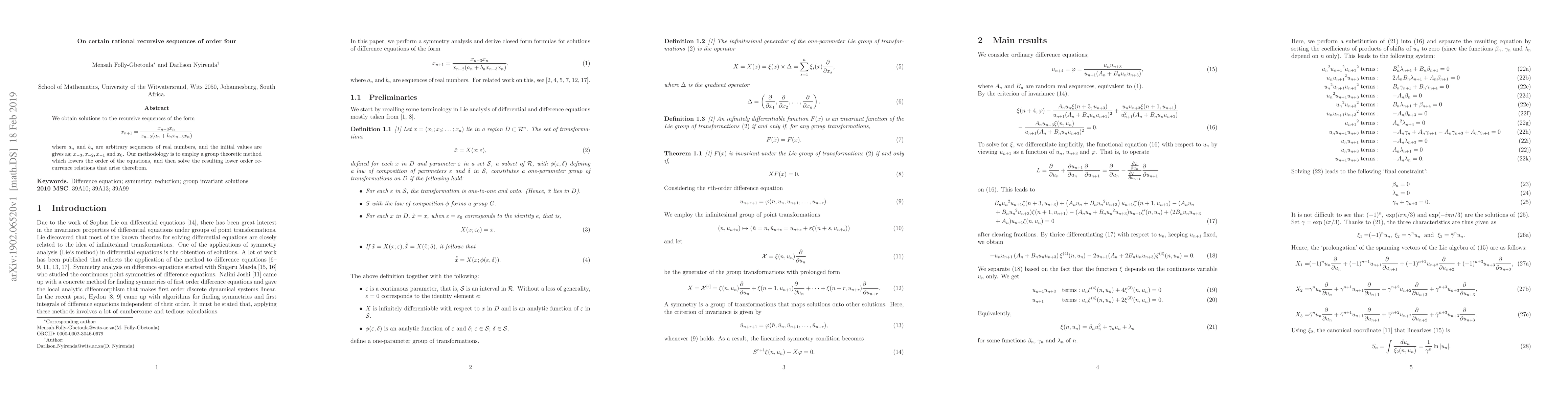 We obtain solutions to the recursive sequences of the form $$x_{n + 1} = \frac{x_{n - 3}x_{n }}{x_{n - 2}(a_n + b_nx_{n -3}x_{n})}$$ where $a_n$ and $b_n$ are arbitrary sequences of real numbers, and the initial values are gives as; $x_{-3},x_{-2}, x_{-1}$ and $x_{0}$. Our methodology is to employ a group theoretic method which lowers the order of the equations, and then solve the resulting lower order recurrence relations that arise therefrom.