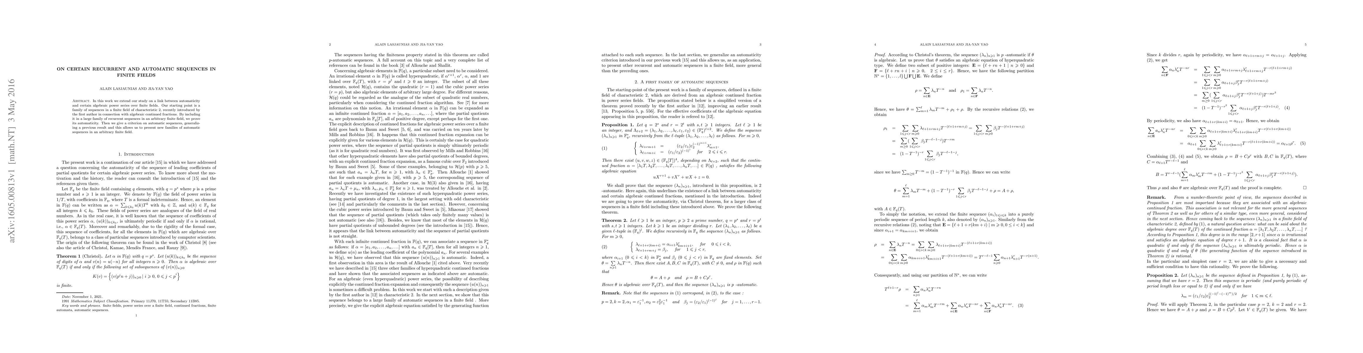 This paper explores the automaticity of a family of recurrent sequences in finite fields, extending previous work on algebraic power series. It establishes a new criterion for automatic sequences, leading to the identification of new families of such sequences in any finite field.