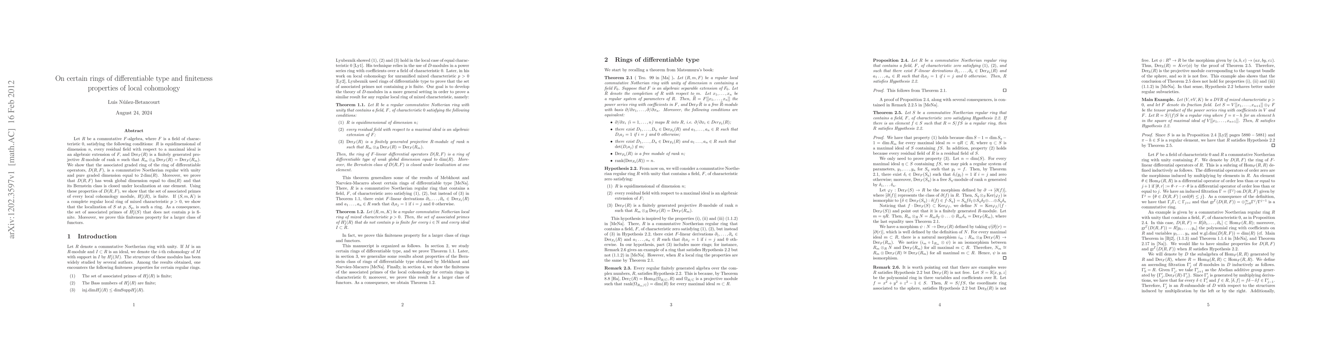 Let $R$ be a commutative $F$-algebra, where $F$ is a field of characteristic 0, satisfying the following conditions: $R$ is equidimensional of dimension $n$, every residual field with respect to a maximal ideal is an algebraic extension of $F,$ and $\Der_F (R)$ is a finitely generated projective $R$-module of rank $n$ such that $R_m\otimes_R \Der_F (R)=\Der_F(R_m)$. We show that the associated graded ring of the ring of differentiable operators, $D(R,F)$, is a commutative Noetherian regular with unity and pure graded dimension equal to $2\dim(R)$. Moreover, we prove that $D(R,F)$ has weak global dimension equal to $\dim(R)$ and that its Bernstein class is closed under localization at one element. Using these properties of $D(R,F)$, we show that the set of associated primes of every local cohomology module, $H^i_I(R)$, is finite. If $(S,m,K)$ is a complete regular local ring of mixed characteristic $p>0$, we show that the localization of $S$ at $p$, $S_p$, is such a ring. As a consequence, the set of associated primes of $H^i_I (S)$ that does not contain $p$ is finite. Moreover, we prove this finiteness property for a larger class of functors.