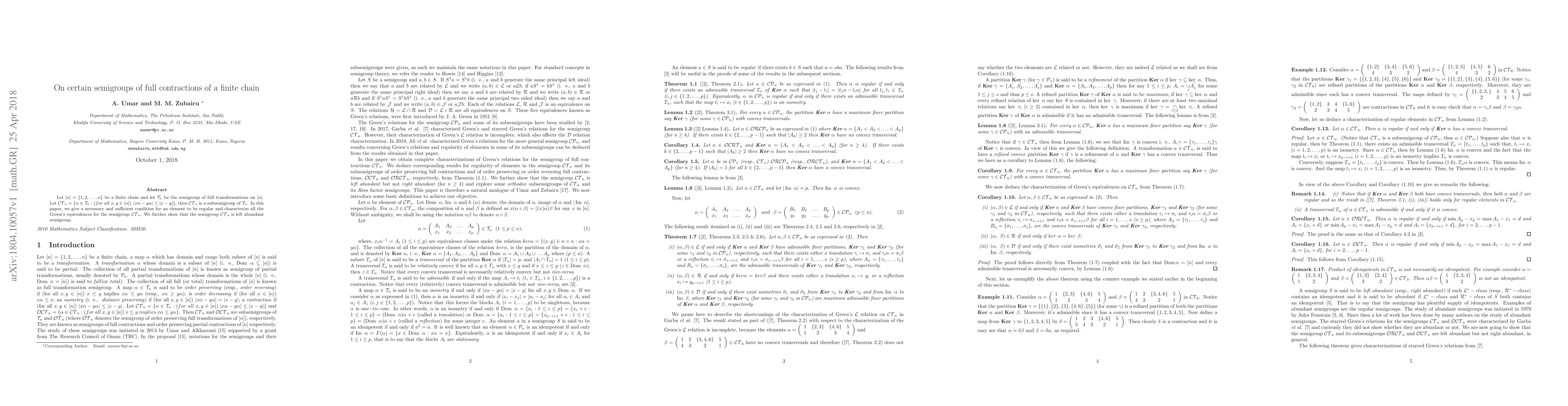 This paper investigates the semigroup $\mathcal{CT}_{n}$ of full contractions on a finite chain $[n]$, establishing a necessary and sufficient condition for regularity and characterizing its Green's equivalences. It also demonstrates that $\mathcal{CT}_{n}$ is a left abundant semigroup.