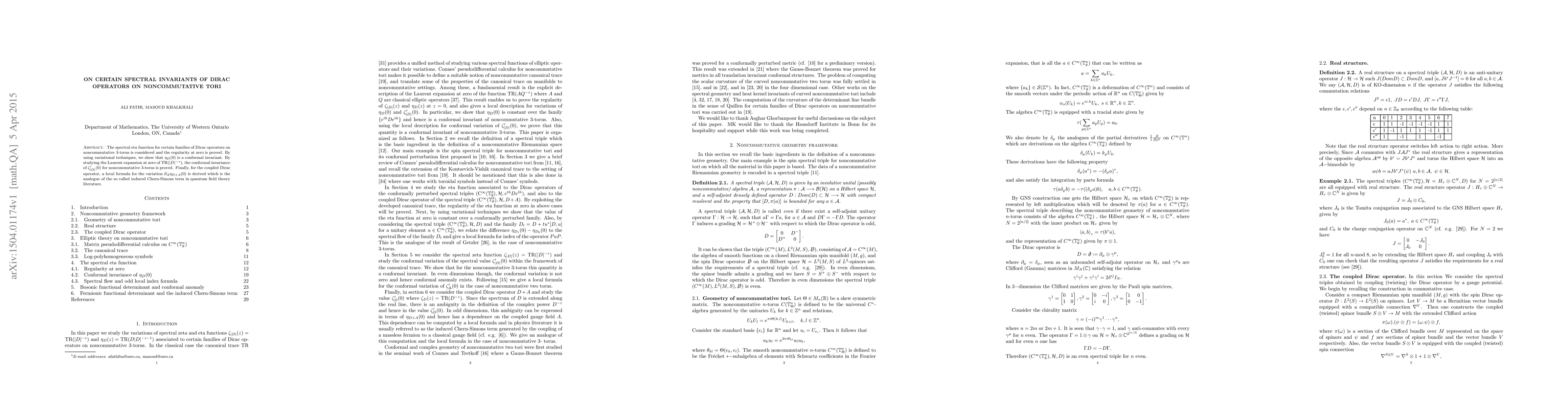 The spectral eta function for certain families of Dirac operators on noncommutative $3$-torus is considered and the regularity at zero is proved. By using variational techniques, we show that $\eta_{D}(0)$ is a conformal invariant. By studying the Laurent expansion at zero of $\text{TR} (|D|^{-z})$, the conformal invariance of $\zeta'_{|D|}(0)$ for noncommutative $3$-torus is proved. Finally, for the coupled Dirac operator, a local formula for the variation $\partial_A\eta_{D+A}(0)$ is derived which is the analogue of the so called induced Chern-Simons term in quantum field theory literature.