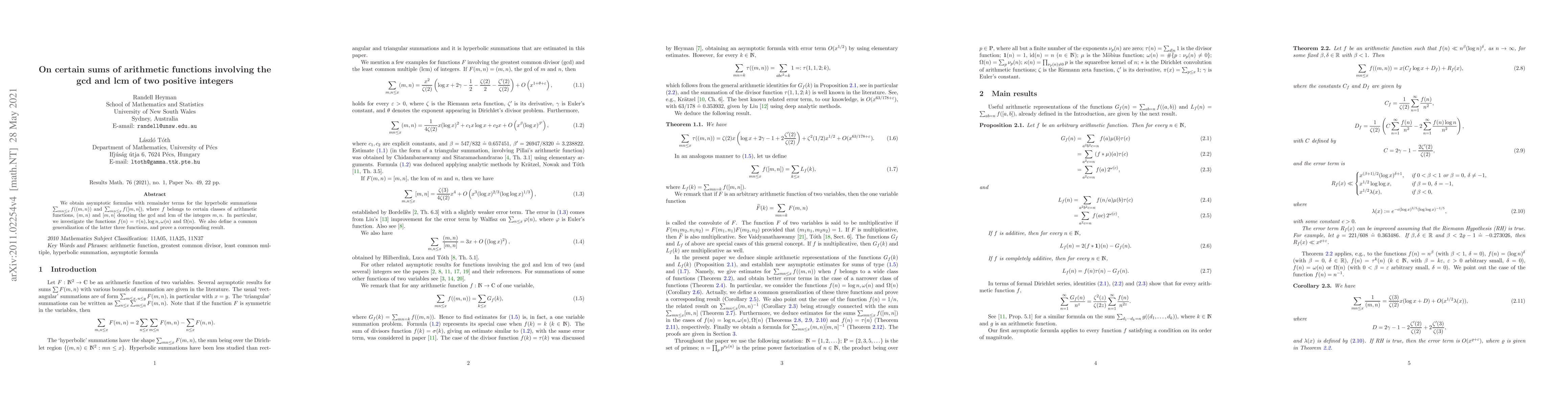 This paper derives asymptotic formulas for hyperbolic summations involving gcd and lcm of two positive integers, providing new insights into arithmetic functions such as tau, log, omega, and Omega functions.