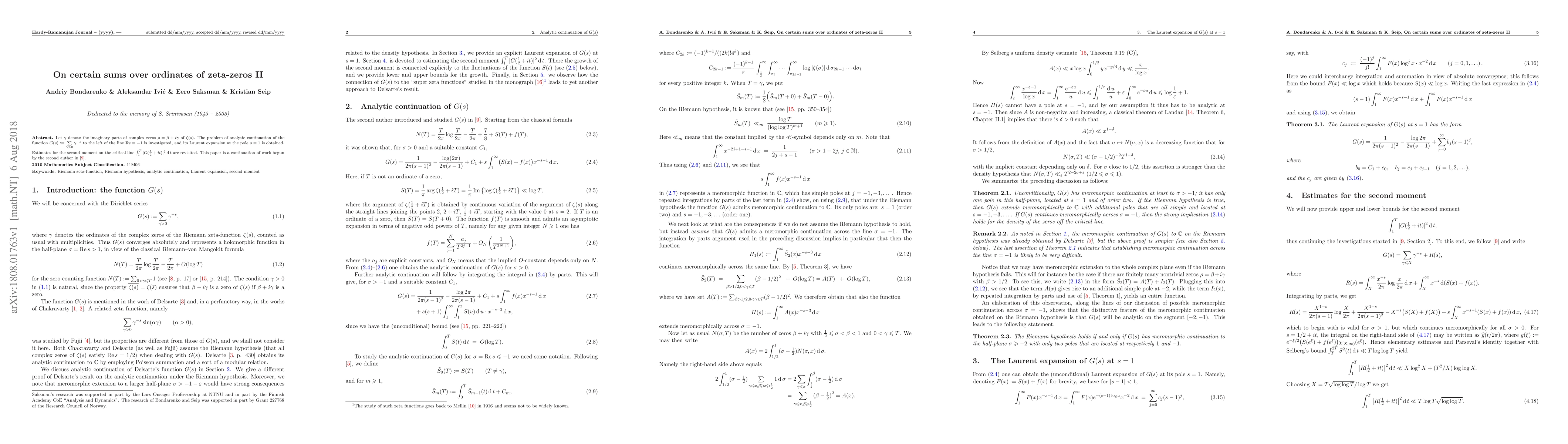 Let $\gamma$ denote the imaginary parts of complex zeros $\rho = \beta+i\gamma$ of $\zeta(s)$. The problem of analytic continuation of the function $G(s) := \sum\limits_{\gamma > 0}\gamma^{-s}$ to the left of the line $\Re s = -1$ is investigated, and its Laurent expansion at the pole $s=1$ is obtained. Estimates for the second moment on the critical line $\int_1^T|G(1/2+it)|^2\,dt$ are revisited. This paper is a continuation of work begun by the second author in 2001.