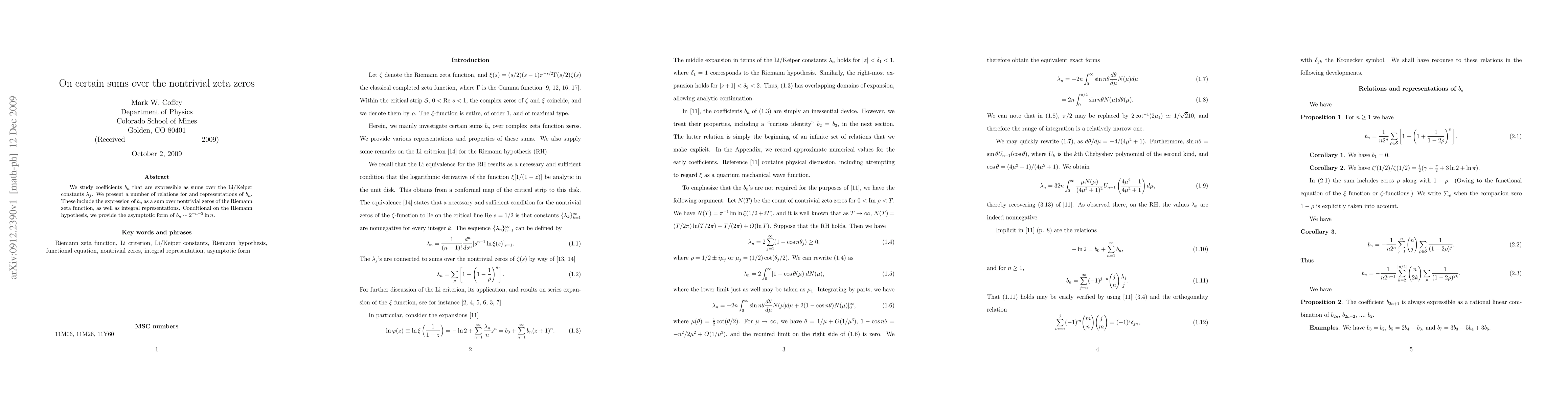 We study coefficients $b_n$ that are expressible as sums over the Li/Keiper constants $\lambda_j$. We present a number of relations for and representations of $b_n$. These include the expression of $b_n$ as a sum over nontrivial zeros of the Riemann zeta function, as well as integral representations. Conditional on the Riemann hypothesis, we provide the asymptotic form of $b_n \sim 2^{-n-2}\ln n$.