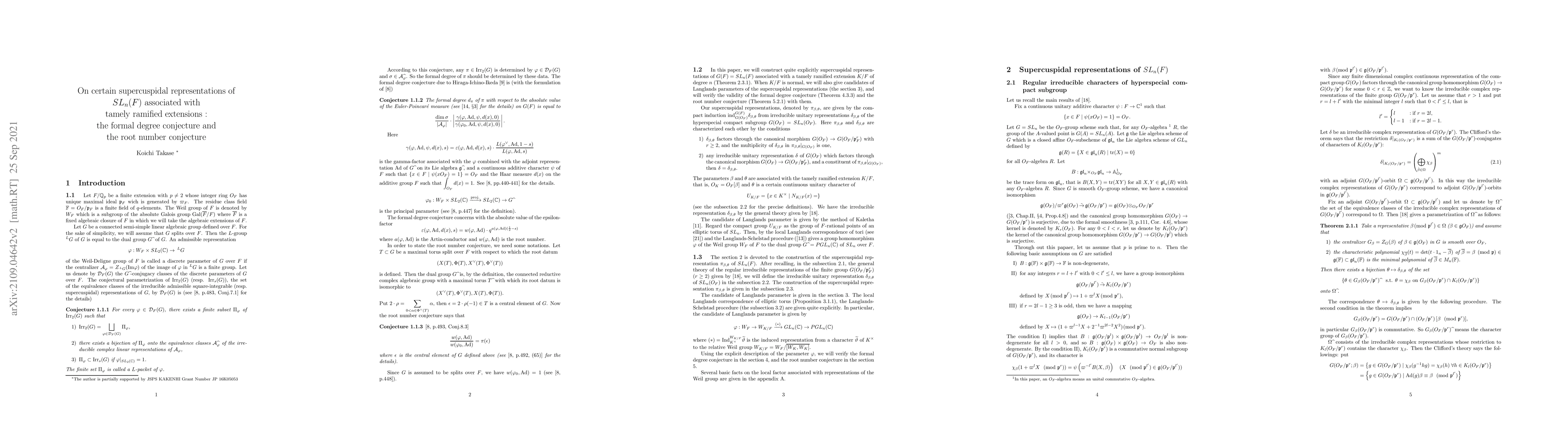 Based upon the general theory, developed by the author, on the parametrization of the irreducible representations of the hyper special compact groups corresponding to the regular adjoint orbit, supercuspidal representations of $SL_n(F)$ are explicitly constructed for which the formal degree conjecture and the root number conjecture are verified with respect to certain $L$-parameter defined, by means of Kaletha, that is, the local Langlands correspondence of tori and the Langlands-Schelstad procedure, by the data parametrizing the irreducible representations of the hyper special compact subgroup $SL_n(O_F)$.