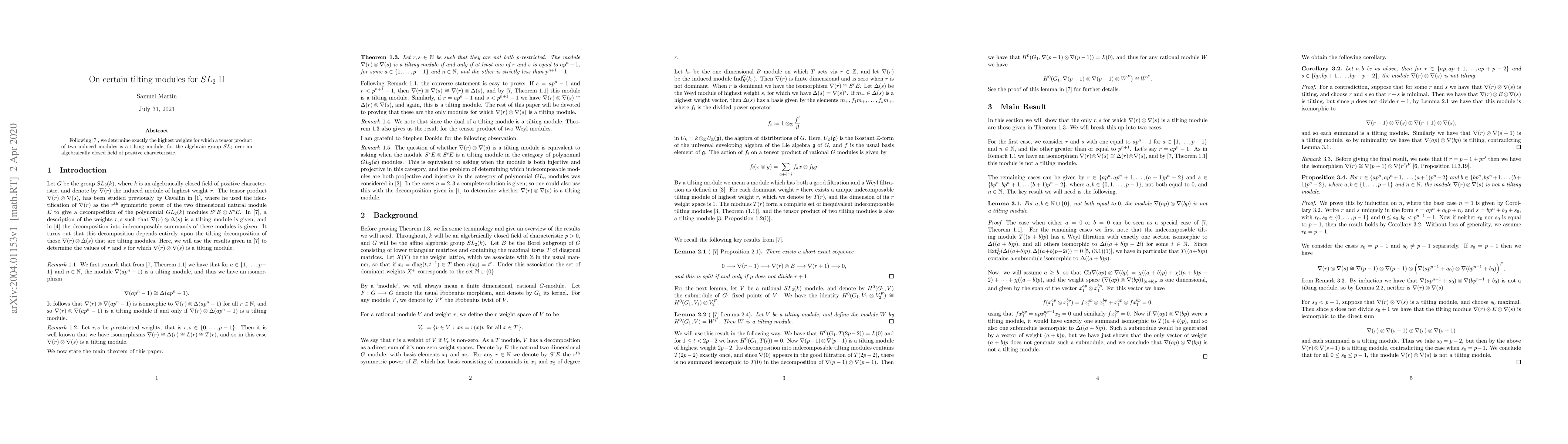 Following the previous work, we determine exactly the highest weights for which a tensor product of two induced modules is a tilting module, for the algebraic group $SL_2$ over an algebraically closed field of positive characteristic.