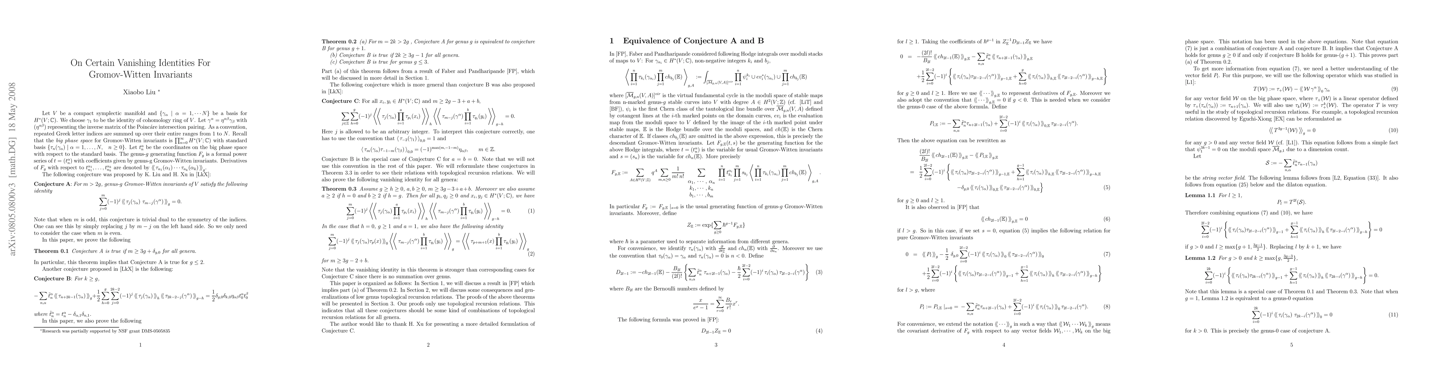 Researchers prove vanishing identities for Gromov-Witten invariants under large genus conditions, extending a conjecture made by Liu and Xu, while also verifying it in low-genus cases.