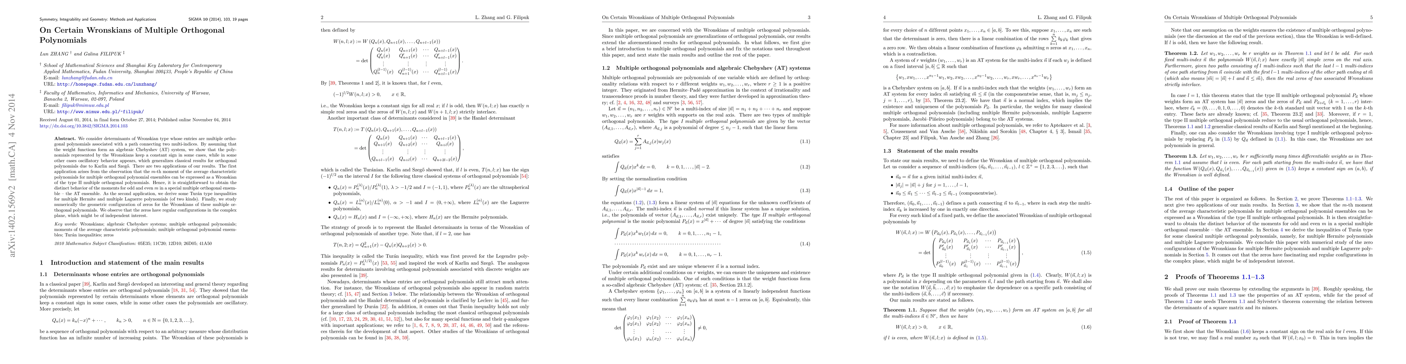 This paper investigates Wronskians of multiple orthogonal polynomials under algebraic Chebyshev systems, showing their sign constancy or oscillatory behavior. It applies these findings to derive moment expressions for average characteristic polynomials and Turán inequalities for multiple Hermite and Laguerre polynomials, while also numerically studying the geometric configurations of their zeros.