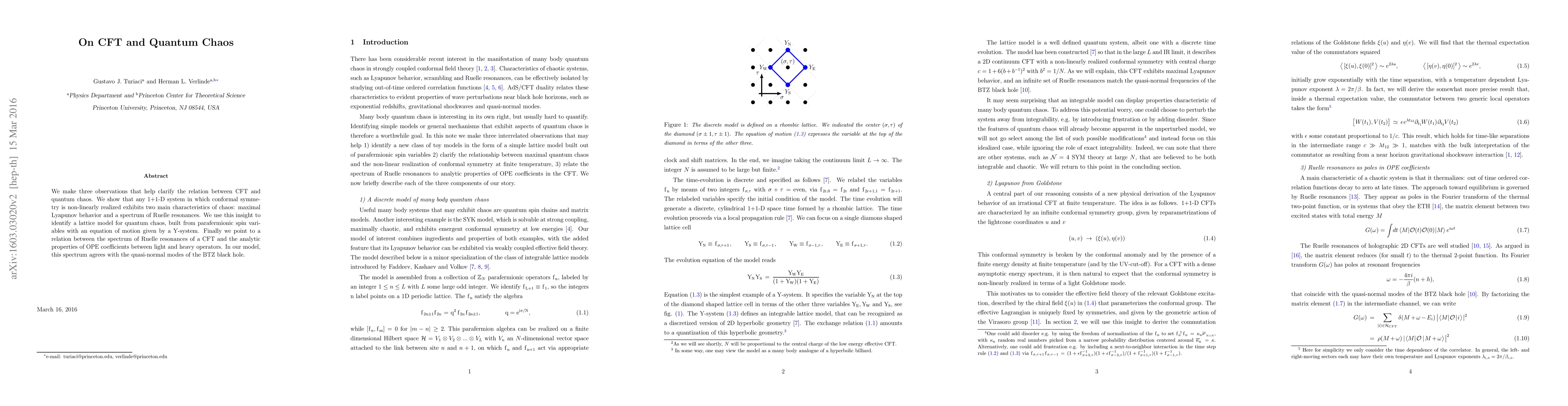 We make three observations that help clarify the relation between CFT and quantum chaos. We show that any 1+1-D system in which conformal symmetry is non-linearly realized exhibits two main characteristics of chaos: maximal Lyapunov behavior and a spectrum of Ruelle resonances. We use this insight to identify a lattice model for quantum chaos, built from parafermionic spin variables with an equation of motion given by a Y-system. Finally we point to a relation between the spectrum of Ruelle resonances of a CFT and the analytic properties of OPE coefficients between light and heavy operators. In our model, this spectrum agrees with the quasi-normal modes of the BTZ black hole.