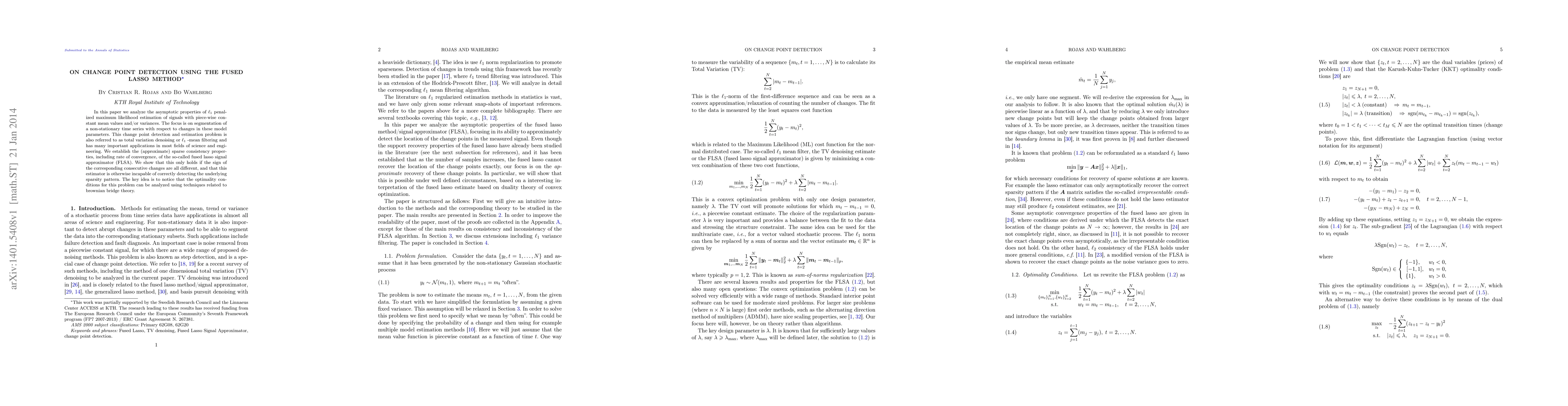 In this paper we analyze the asymptotic properties of l1 penalized maximum likelihood estimation of signals with piece-wise constant mean values and/or variances. The focus is on segmentation of a non-stationary time series with respect to changes in these model parameters. This change point detection and estimation problem is also referred to as total variation denoising or l1 -mean filtering and has many important applications in most fields of science and engineering. We establish the (approximate) sparse consistency properties, including rate of convergence, of the so-called fused lasso signal approximator (FLSA). We show that this only holds if the sign of the corresponding consecutive changes are all different, and that this estimator is otherwise incapable of correctly detecting the underlying sparsity pattern. The key idea is to notice that the optimality conditions for this problem can be analyzed using techniques related to brownian bridge theory.