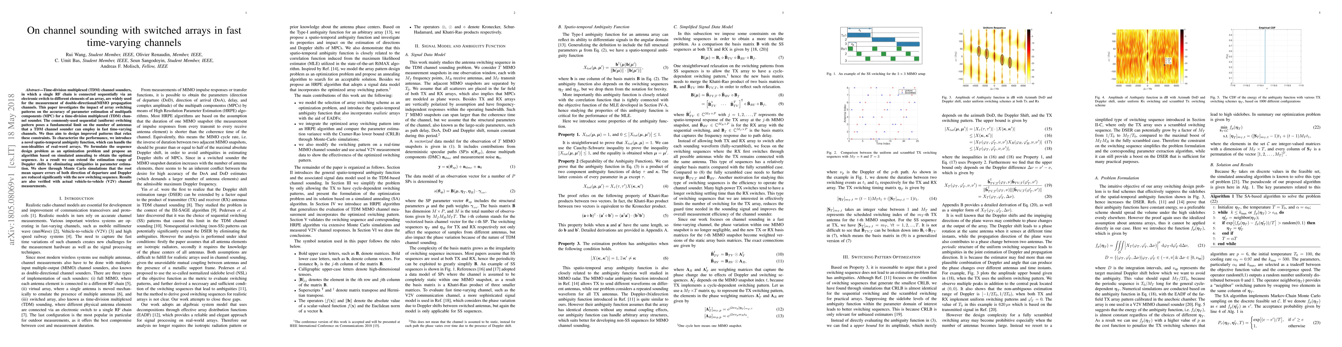 Time-division multiplexed (TDM) channel sounders, in which a single RF chain is connected sequentially via an electronic switch to different elements of an array, are widely used for the measurement of double-directional/MIMO propagation channels. This paper investigates the impact of array switching patterns on the accuracy of parameter estimation of multipath components (MPC) for a time-division multiplexed (TDM) channel sounder. The commonly-used sequential (uniform) switching pattern poses a fundamental limit on the number of antennas that a TDM channel sounder can employ in fast time-varying channels. We thus aim to design improved patterns that relax these constraints. To characterize the performance, we introduce a novel spatio-temporal ambiguity function, which can handle the non-idealities of real-word arrays. We formulate the sequence design problem as an optimization problem and propose an algorithm based on simulated annealing to obtain the optimal sequence. As a result we can extend the estimation range of Doppler shifts by eliminating ambiguities in parameter estimation. We show through Monte Carlo simulations that the root mean square errors of both direction of departure and Doppler are reduced significantly with the new switching sequence. Results are also verified with actual vehicle-to-vehicle (V2V) channel measurements.