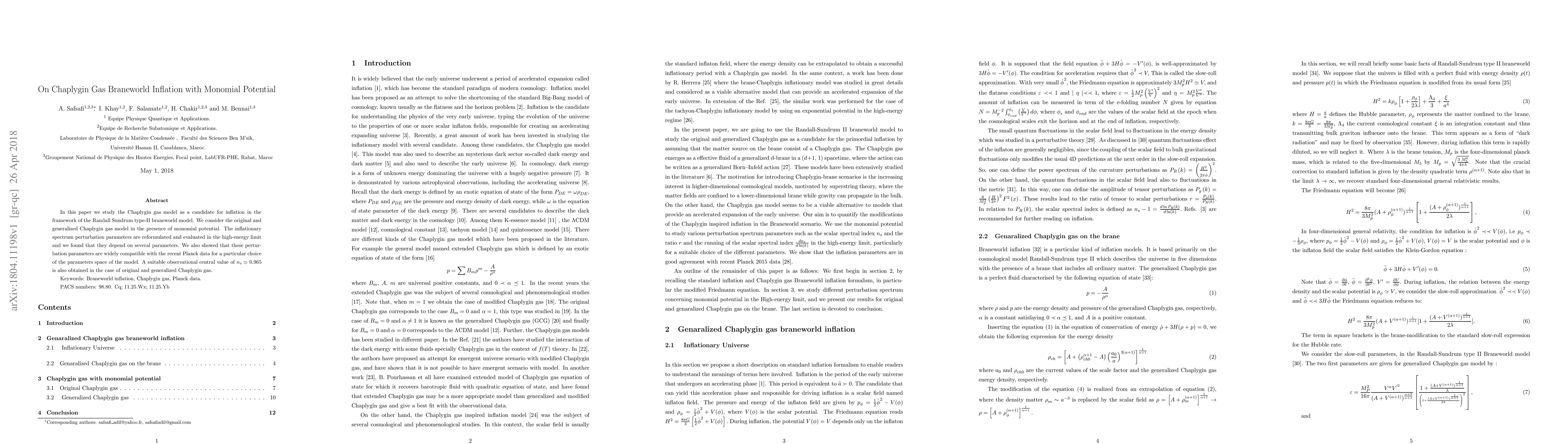 This paper explores the Chaplygin gas model for inflation within the Randall Sundrum type-II braneworld framework, considering both original and generalized forms with monomial potentials. It finds that inflationary perturbation parameters are consistent with Planck data and yield an observational central value of $n_{s} \simeq 0.965$.