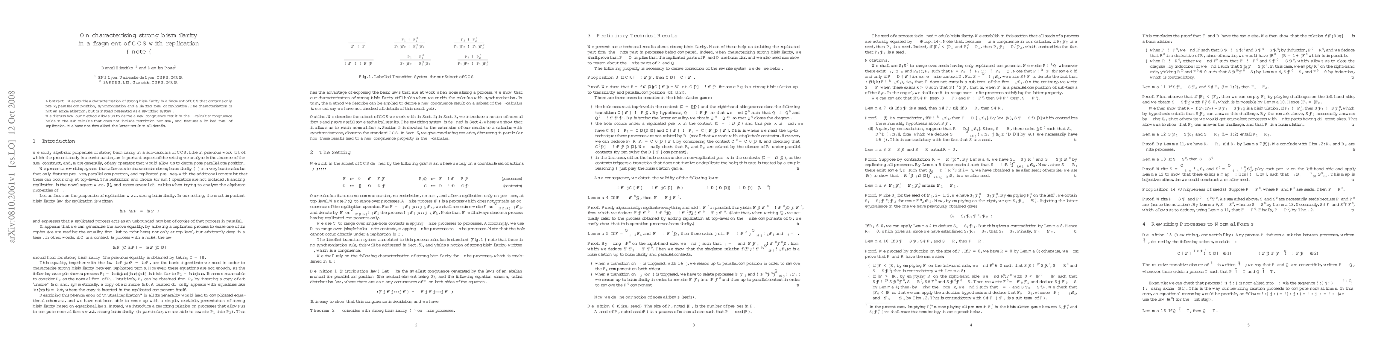 This paper characterises strong bisimilarity in a restricted fragment of CCS with prefix, parallel composition, synchronisation, and limited replication, presenting the characterisation via a rewriting system. The method also yields a new congruence result in the $\pi$-calculus for a sub-calculus excluding restriction and sum, though details are not fully formalised.