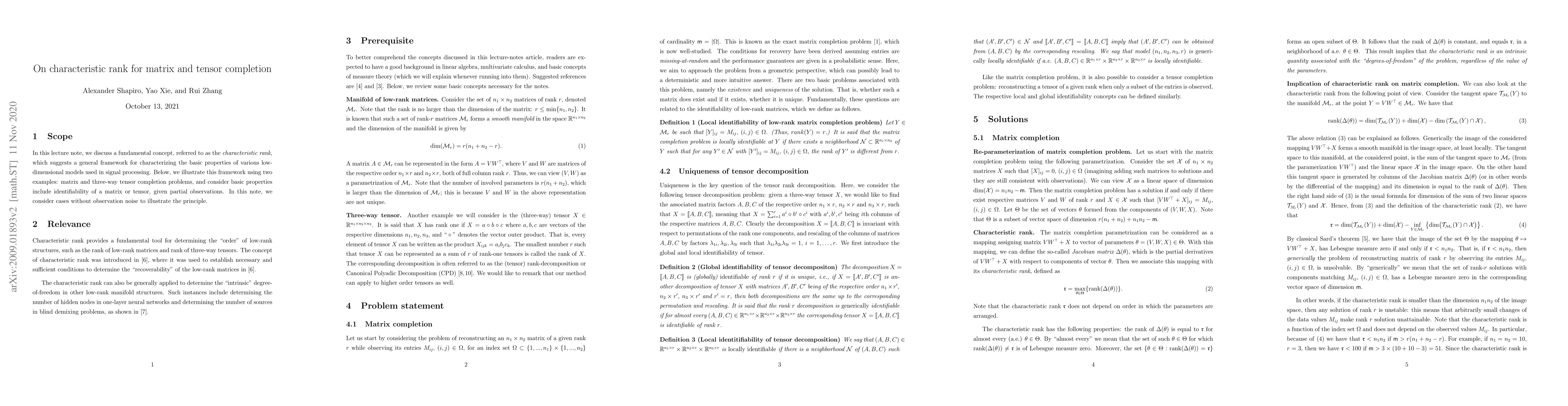 This lecture note introduces the concept of 'characteristic rank', a framework for understanding low-dimensional models in signal processing. It illustrates this with matrix and tensor completion examples, focusing on identifiability from partial observations, under noise-free conditions.