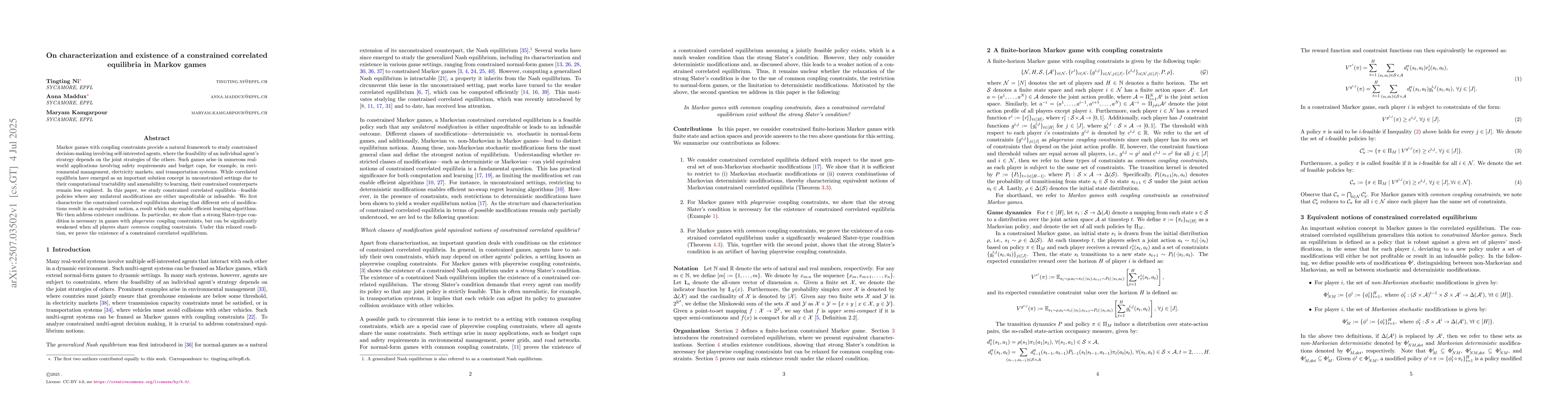 Markov games with coupling constraints provide a natural framework to study constrained decision-making involving self-interested agents, where the feasibility of an individual agent's strategy depends on the joint strategies of the others. Such games arise in numerous real-world applications involving safety requirements and budget caps, for example, in environmental management, electricity markets, and transportation systems. While correlated equilibria have emerged as an important solution concept in unconstrained settings due to their computational tractability and amenability to learning, their constrained counterparts remain less explored. In this paper, we study constrained correlated equilibria-feasible policies where any unilateral modifications are either unprofitable or infeasible. We first characterize the constrained correlated equilibrium showing that different sets of modifications result in an equivalent notion, a result which may enable efficient learning algorithms. We then address existence conditions. In particular, we show that a strong Slater-type condition is necessary in games with playerwise coupling constraints, but can be significantly weakened when all players share common coupling constraints. Under this relaxed condition, we prove the existence of a constrained correlated equilibrium.