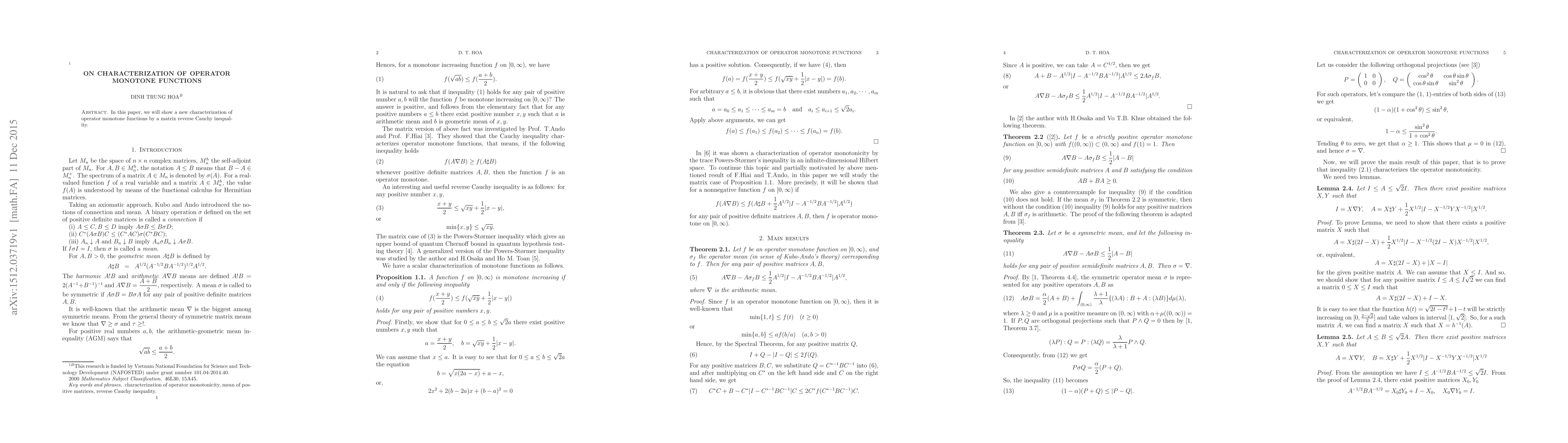 Summary: This paper introduces a novel characterization of operator monotone functions using a matrix reverse Cauchy inequality, providing a new perspective on these functions.
