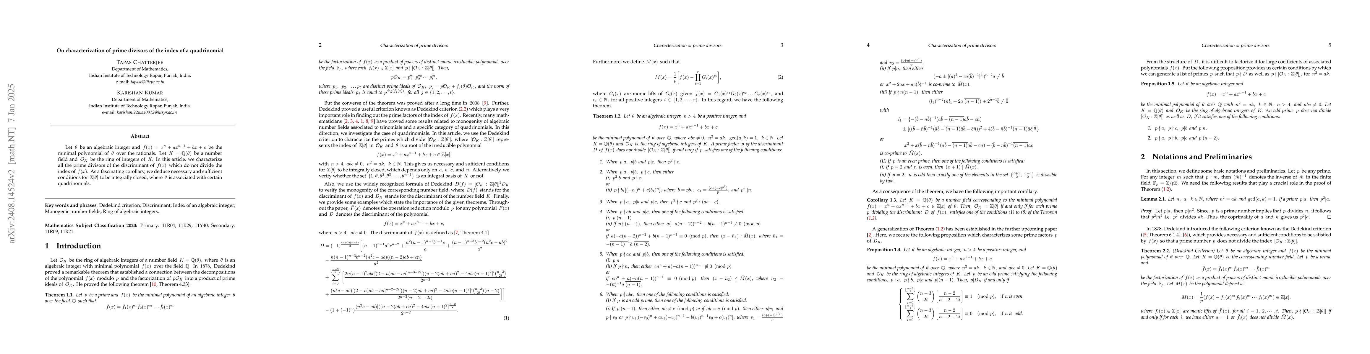Let $\theta$ be an algebraic integer and $f(x)=x^{n}+ax^{n-1}+bx+c$ be the minimal polynomial of $\theta$ over the rationals. Let $K=\mathbb{Q}(\theta)$ be a number field and $\mathcal{O}_{K}$ be the ring of integers of $K.$ In this article, we characterize all the prime divisors of the discriminant of $f(x)$ which do not divide the index of $f(x).$ As a fascinating corollary, we deduce necessary and sufficient conditions for the monogenity of the field $K=\mathbb{Q}(\theta),$ where $\theta$ is associated with certain quadrinomials.