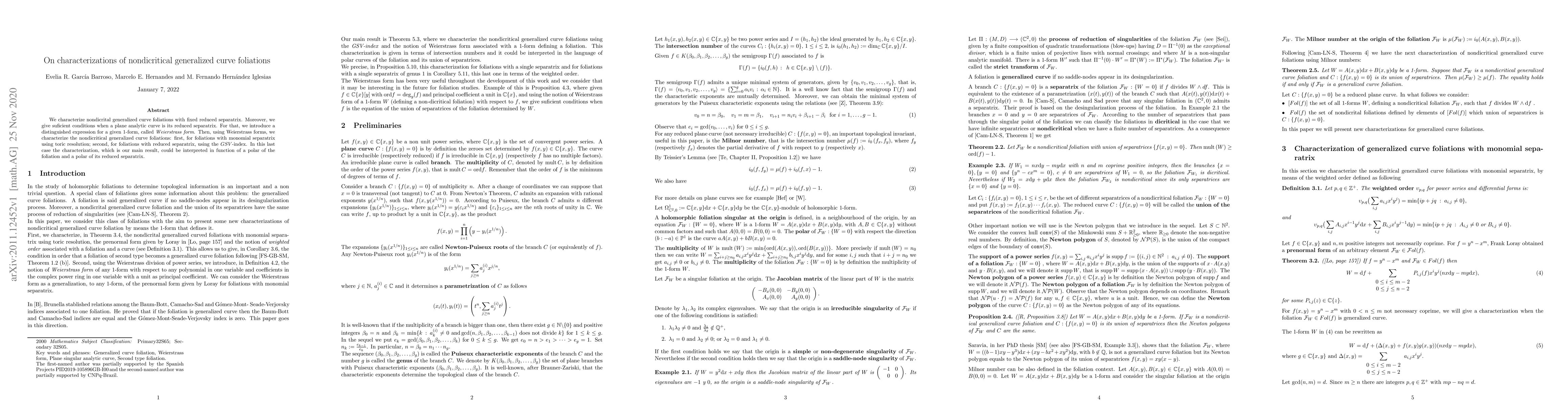 This paper characterizes nondicritical generalized curve foliations with a fixed reduced separatrix, introducing a Weierstrass form for 1-forms. It provides sufficient conditions for a plane analytic curve to be its reduced separatrix, using toric resolution and the $GSV$-index for characterization.